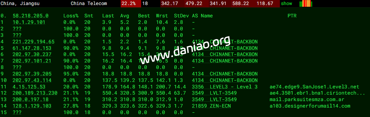 广东 电信 Telxius -> 163 地理路径:阿根廷 -> 美国 -> 广东 自治系统路径:AS21859 -> AS12956 -> AS3356 -> AS12956 -> AS4134 2-5 0.38ms 10.23.*.* * RFC1918 6 0.50ms 128.1.*.* AS21859 阿根廷 布宜诺斯艾利斯 zenlayer.com 7 1.19ms 190.98.*.* AS12956 [LACNIC-CIDR] 阿根廷 布宜诺斯艾利斯 telxius.com 8 164.76ms 4.69.*.* AS3356 美国 加利福尼亚 圣何塞 lumen.com 9 118.24ms 176.52.*.* AS12956 [TDATANET] 美国 佛罗里达州 迈阿密 telxius.com 10-11 119.22ms 94.142.*.* AS12956 [ES-TDATACORP] 美国 佛罗里达州 迈阿密 telxius.com 12 193.17ms 202.97.*.* AS4134 [CHINANET-BB] 美国 加利福尼亚 洛杉矶 chinatelecom.com.cn 电信 14 348.06ms 202.97.*.* AS4134 [CHINANET-BB] 中国 广东 广州 chinatelecom.com.cn 电信 19 318.23ms 183.47.*.* AS4134 [APNIC-AP] 中国 广东省 广州市 chinatelecom.com.cn 电信 广东 联通 Level3 -> 4837 地理路径:阿根廷 -> 美国 -> 广东 自治系统路径:AS21859 -> AS3549 -> AS3356 -> AS4837 -> AS17816 -> AS136958 2-5 0.61ms 10.23.*.* * RFC1918 6 0.73ms 128.1.*.* AS21859 阿根廷 布宜诺斯艾利斯 zenlayer.com 7-8 0.92ms 200.0.*.* AS3549 阿根廷 布宜诺斯艾利斯 lumen.com 9-10 157.03ms 4.69.*.* AS3356 美国 加利福尼亚 洛杉矶 lumen.com 11-12 324.06ms 219.158.*.* AS4837 [CU169-BACKBONE] 中国 广东 广州 chinaunicom.cn 联通 13 325.63ms 221.4.*.* AS17816 [UNICOM-GD] 中国 广东 广州 中国联通 联通 19 414.06ms 157.148.*.* AS136958 [UNICOM-GD] 中国 广东省 广州市 chinaunicom.cn 联通 广东 移动 Level3 -> CMI 地理路径:阿根廷 -> 德国 -> 香港 -> 广东 自治系统路径:AS21859 -> AS3549 -> AS3356 -> AS58453 -> AS9808 -> AS56040 2-5 0.47ms 10.23.*.* * RFC1918 6-7 0.41ms 128.1.*.* AS21859 阿根廷 布宜诺斯艾利斯 zenlayer.com 8 0.90ms 200.0.*.* AS3549 阿根廷 布宜诺斯艾利斯 lumen.com 9 214.48ms 4.68.*.* AS3356 德国 黑森 美因河畔法兰克福 lumen.com 10 214.00ms 223.120.*.* AS58453 [CMI-INT] 德国 黑森 美因河畔法兰克福 cmi.chinamobile.com 移动 11 359.72ms 223.120.*.* AS58453 [CMI-INT] 中国 香港 cmi.chinamobile.com 移动 12-15 377.70ms 221.183.*.* AS9808 [CMNET] 中国 广东 广州 I-C chinamobileltd.com 移动 16 415.00ms 183.235.*.* AS56040 [APNIC-AP] 中国 广东 广州 gd.10086.cn 移动 17 419.27ms 211.136.*.* AS56040 [CMNET] 中国 广东 广州 gd.10086.cn 移动 22 390.77ms 211.139.*.* AS56040 [CMNET] 中国 广东 广州 gd.10086.cn 移动