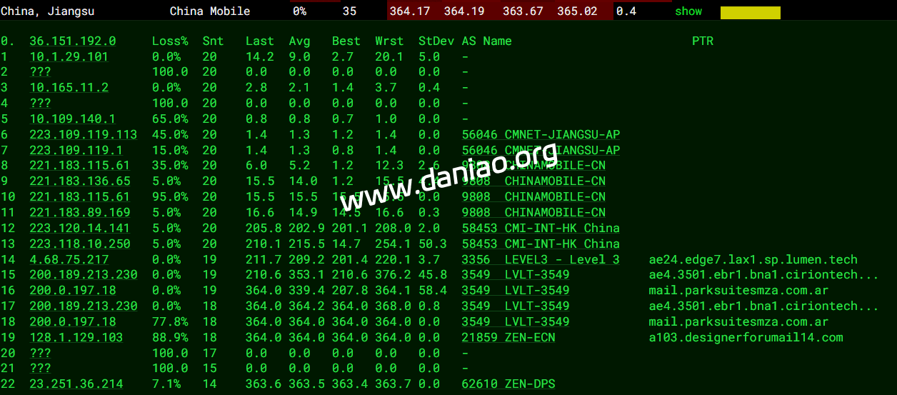 上海移动回程( Level3 -> CMI,地理路径:阿根廷 -> 美国 -> 上海)