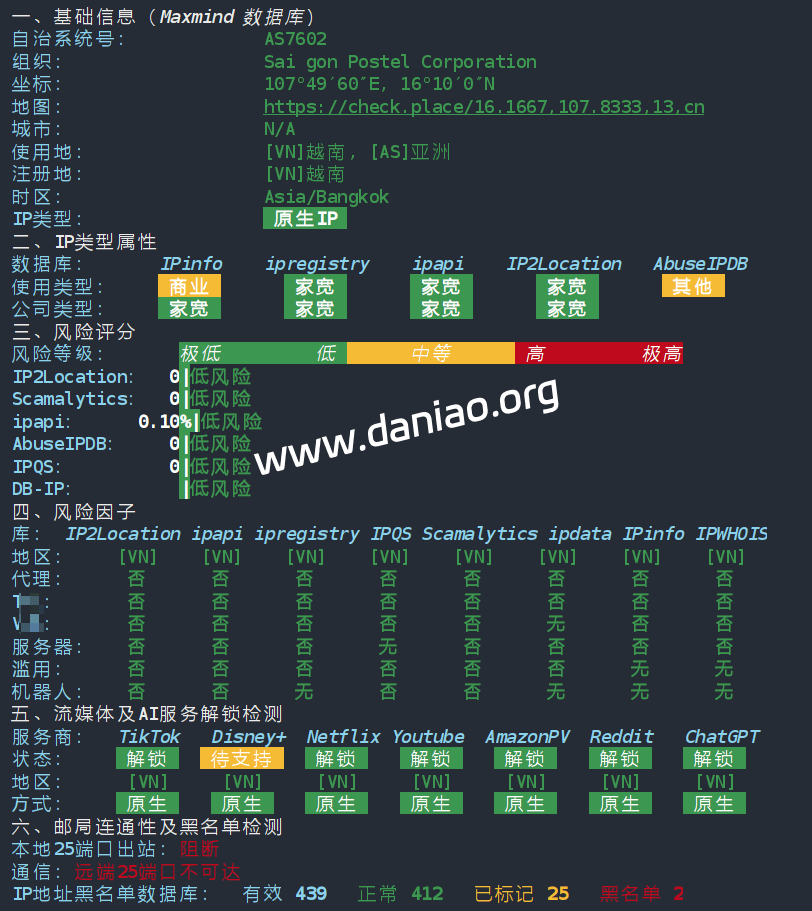 IP为越南原生IP,质量还不错。不过没有优化线路。建议落地使用~