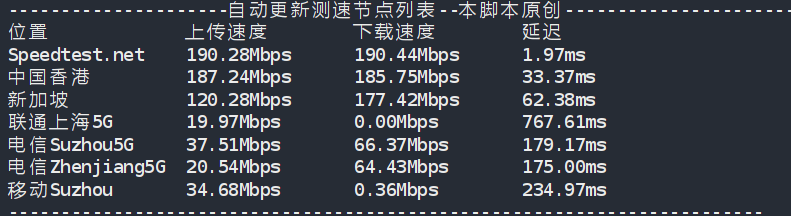 CPU Model : Intel(R) Xeon(R) CPU E5-2686 v4 @ 2.30GHz CPU Cores : 4 @ 2299.996 MHz CPU Cache : 46080 KB AES-NI : ✓ Enabled VM-x/AMD-V : ✓ Enabled Total Disk : 78.7 GB (1.2 GB Used) Total Mem : 3.8 GB (85.1 MB Used) System uptime : 0 days, 20 hour 41 min Load average : 0.00, 0.00, 0.00 OS : Debian GNU/Linux 11 Arch : x86_64 (64 Bit) Kernel : 5.10.0-11-cloud-amd64 TCP CC : bbr Virtualization : KVM IPv4/IPv6 : ✓ Online / ✗ Offline Organization : AS7602 Sai gon Postel Corporation Location : Ho Chi Minh City / VN Region : Ho Chi Minh City (HCMC) ---------------------------------------------------------------------- I/O Speed(1st run) : 581 MB/s I/O Speed(2nd run) : 575 MB/s I/O Speed(3rd run) : 622 MB/s I/O Speed(average) : 592.7 MB/s ---------------------------------------------------------------------- Node Name Upload Speed Download Speed Latency Speedtest.net 189.57 Mbps 190.02 Mbps 11.52 ms Paris, FR 172.90 Mbps 215.30 Mbps 214.62 ms Hong Kong, CN 191.01 Mbps 190.64 Mbps 37.84 ms Singapore, SG 189.84 Mbps 191.41 Mbps 63.18 ms Tokyo, JP 188.54 Mbps 8.43 Mbps 101.21 ms ----------------------------------------------------------------------