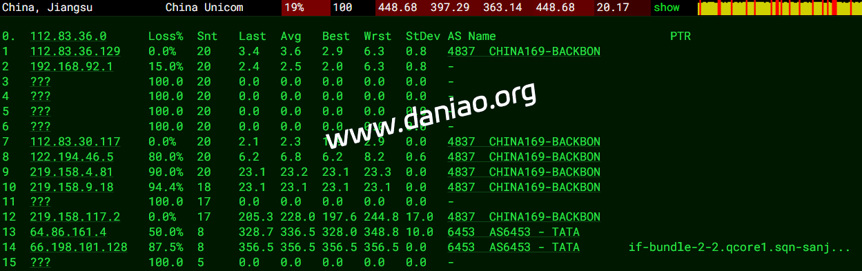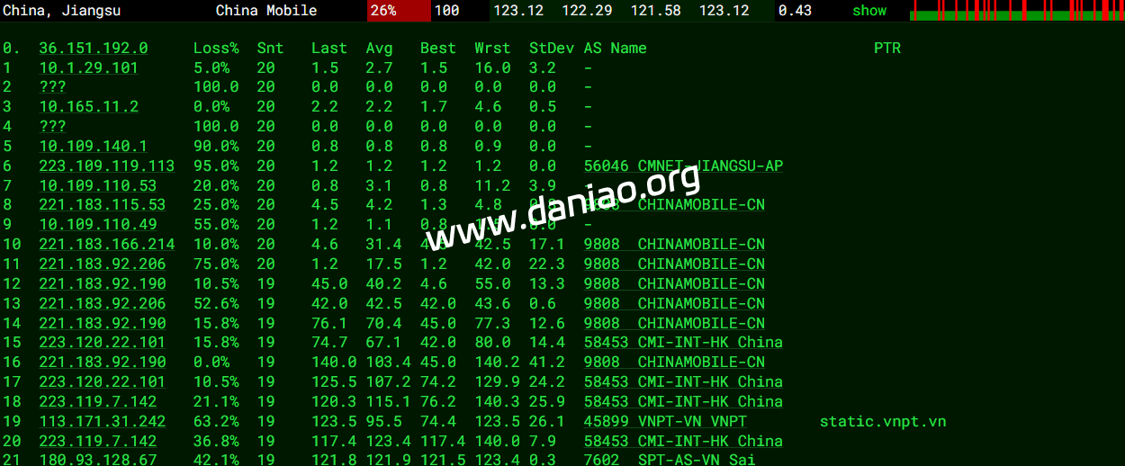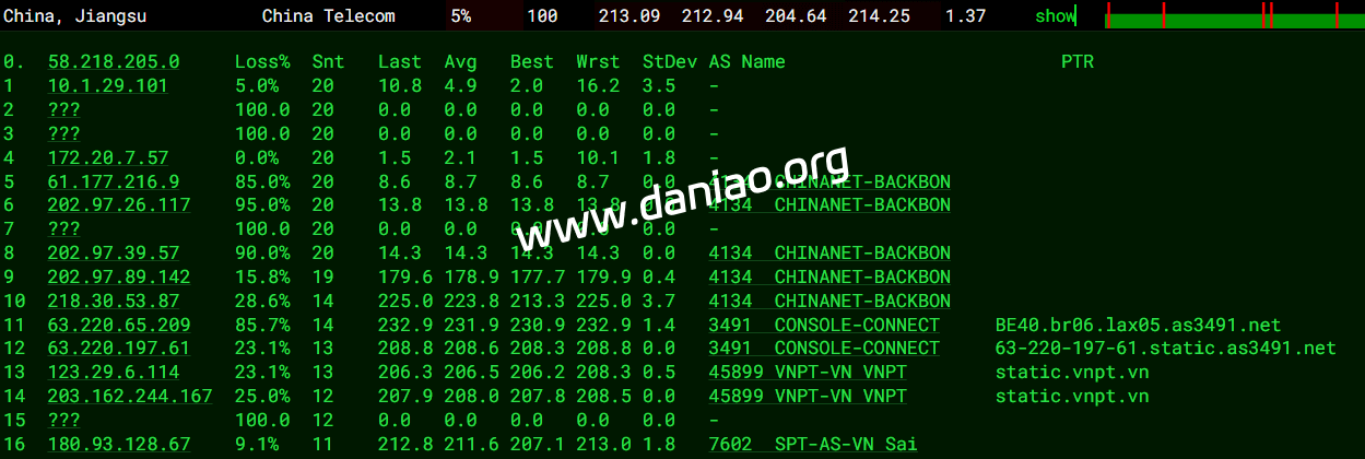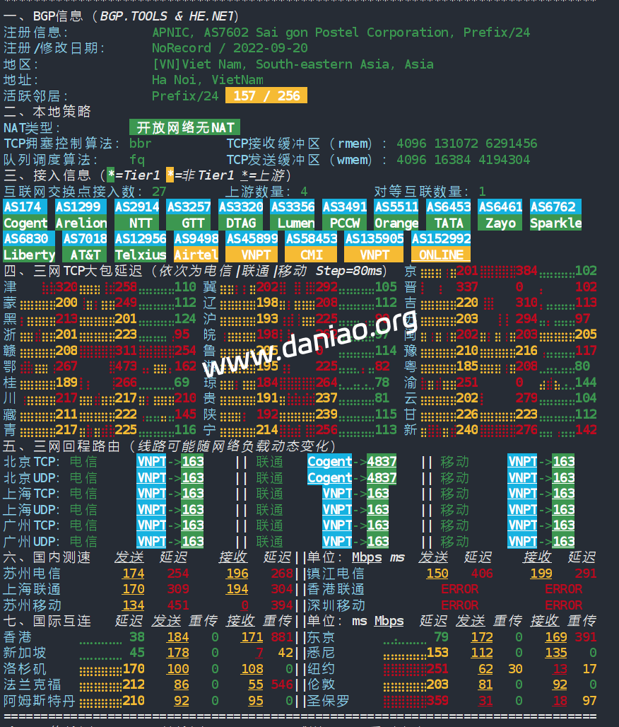 上海 电信 VNPT -> 163 地理路径:越南 -> 香港 -> 上海 自治系统路径:AS45899 -> AS23764 -> AS4134 -> AS4812 2 1.16ms 10.132.*.* * RFC1918 3 0.90ms 222.255.*.* AS45899 [VDC-NET] 越南 河内市 vnpt.vn 4 31.91ms 113.171.*.* AS45899 [VNPT-VN] 越南 河内市 vnpt.vn 5-8 25.05ms 113.171.*.* AS45899 [VNPT-VN] 越南 岘港市 vnpt.vn 9 26.78ms 69.194.*.* AS23764 * 中国 香港 电信/CTGNet 10 32.22ms 69.194.*.* * 中国 香港 11 175.55ms 203.22.*.* AS23764 [CTG-CN] * 中国 香港 163-CTG CTGNet 12-15 177.90ms 202.97.*.* AS4134 [CHINANET-BB] 中国 上海 X-I chinatelecom.com.cn 20 183.45ms 101.226.*.* AS4812 [CHINANET-SH] 中国 上海市 chinatelecom.cn 电信 上海 联通 VNPT -> 163 地理路径:越南 -> 香港 -> 上海 自治系统路径:AS45899 -> AS23764 -> AS4134 -> AS140979 2 0.93ms 10.132.*.* * RFC1918 3 1.18ms 14.238.*.* AS45899 越南 河内市 vnpt.vn 4-6 40.70ms 113.171.*.* AS45899 [VNPT-VN] 越南 岘港市 vnpt.vn 7-8 27.50ms 113.171.*.* AS45899 [VNPT-VN] 中国 香港 vnpt.vn 9 25.39ms 69.194.*.* * 中国 香港 10 169.57ms 203.25.*.* [CTHKI-HK] * 中国 香港 163-CTG 中国电信国际 11 181.07ms 203.22.*.* AS23764 [CTG-CN] * 中国 香港 163-CTG CTGNet 12-15 193.21ms 202.97.*.* AS4134 [CHINANET-BB] 中国 上海 chinatelecom.com.cn 24 208.62ms 58.246.*.* AS140979 中国 上海市 chinaunicom.cn 联通 上海 移动 VNPT -> 163 地理路径:越南 -> 香港 -> 上海 自治系统路径:AS45899 -> AS23764 -> AS4134 -> AS9808 2 0.83ms 10.132.*.* * RFC1918 3 1.25ms 222.255.*.* AS45899 [VDC-NET] 越南 河内市 vnpt.vn 4 31.41ms 113.171.*.* AS45899 [VNPT-VN] 越南 河内市 vnpt.vn 5-6 26.18ms 113.171.*.* AS45899 [VNPT-VN] 越南 岘港市 vnpt.vn 7 29.00ms 113.171.*.* AS45899 [VNPT-VN] 中国 香港 vnpt.vn 9 27.07ms 69.194.*.* AS23764 * 中国 香港 电信/CTGNet 10 168.95ms 203.25.*.* [CTHKI-HK] * 中国 香港 163-CTG 中国电信国际 11 182.59ms 203.22.*.* AS23764 [CTG-CN] * 中国 香港 163-CTG CTGNet 12-15 198.84ms 202.97.*.* AS4134 [CHINANET-BB] 中国 上海 chinatelecom.com.cn 17 101.98ms 221.183.*.* AS9808 [CMNET] 中国 上海 chinamobileltd.com 移动 20 89.75ms 117.185.*.* AS9808 [CMNET] 中国 上海市 chinamobileltd.com 移动