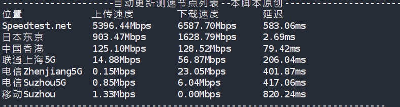 CPU Model : Intel Xeon Processor (Cascadelake) CPU Cores : 1 @ 2899.998 MHz CPU Cache : 16384 KB AES-NI : ✓ Enabled VM-x/AMD-V : ✓ Enabled Total Disk : 19.6 GB (1.3 GB Used) Total RAM : 1.9 GB (258.4 MB Used) System Uptime : 0 days, 17 hour 54 min Load Average : 0.00, 0.00, 0.03 OS : Debian GNU/Linux 12 (bookworm) Arch : x86_64 (64 Bit) Kernel : 6.1.0-18-amd64 TCP Congestion Ctrl: bbr Virtualization : KVM IPv4/IPv6 : ✓ Online / ✗ Offline Organization : AS21859 Zenlayer Inc Location : Tokyo / JP Region : Tokyo ---------------------------------------------------------------------- I/O Speed(1st run) : 462 MB/s I/O Speed(2nd run) : 476 MB/s I/O Speed(3rd run) : 299 MB/s I/O Speed(average) : 412.3 MB/s ---------------------------------------------------------------------- Node Name Upload Speed Download Speed Latency Speedtest.net Test failed Los Angeles, US 722.26 Mbps 5414.14 Mbps 112.74 ms Dallas, US 586.41 Mbps 5593.18 Mbps 147.15 ms Montreal, CA 418.12 Mbps 15.45 Mbps 169.51 ms Paris, FR 327.06 Mbps 3272.36 Mbps 245.27 ms Amsterdam, NL 314.36 Mbps 3075.48 Mbps 248.25 ms Suzhou, CN 18.48 Mbps 2256.15 Mbps 221.59 ms Ningbo, CN Test failed Hong Kong, CN 1528.65 Mbps 9184.28 Mbps 62.33 ms Singapore, SG 1248.67 Mbps 8719.16 Mbps 67.81 ms Taipei, CN 2755.75 Mbps 8847.99 Mbps 30.30 ms Tokyo, JP 8964.88 Mbps 9138.80 Mbps 1.89 ms ----------------------------------------------------------------------