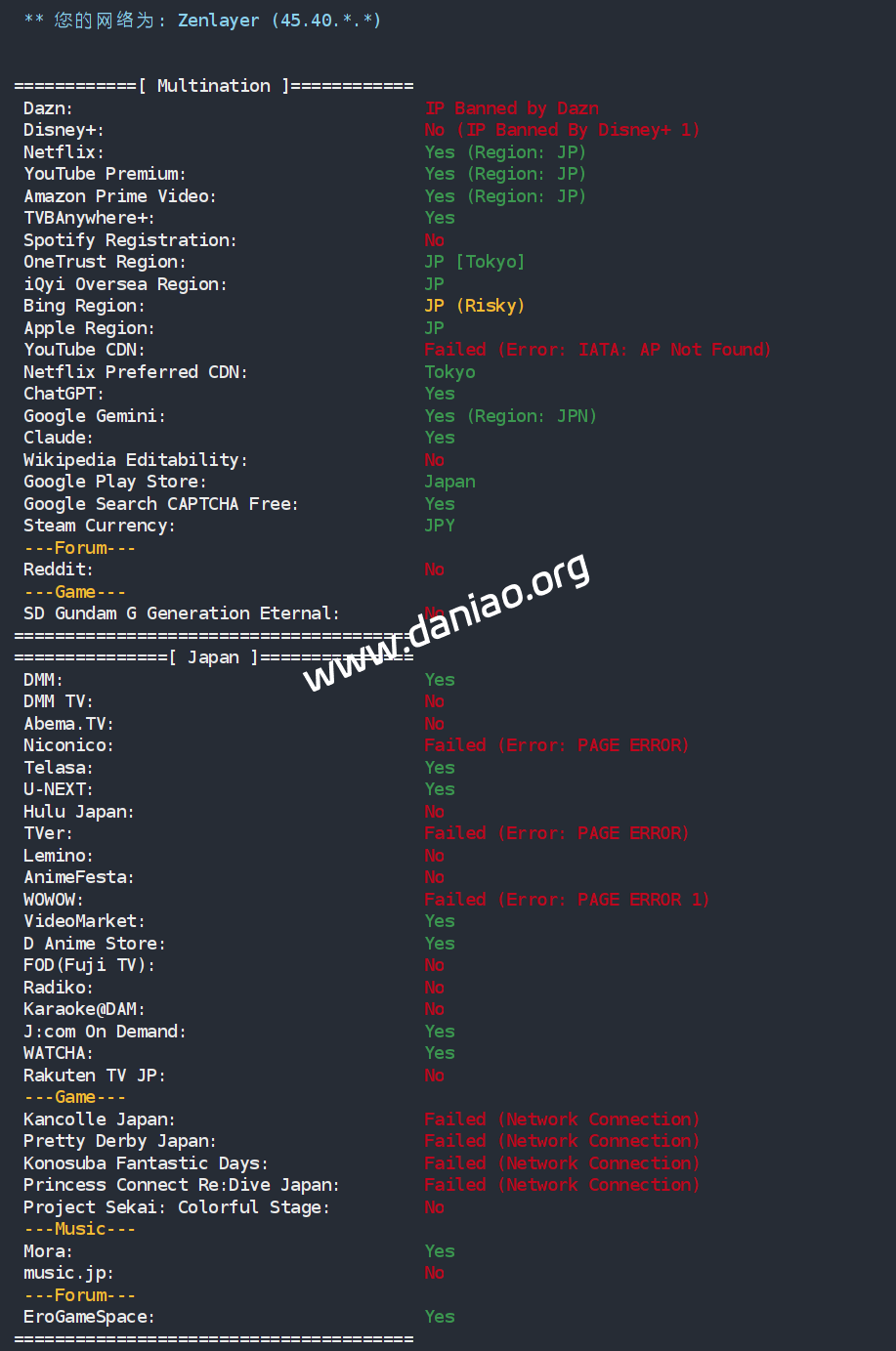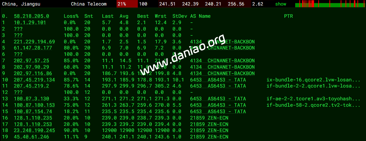 北京 电信 NTT -> 163 地理路径:日本 -> 上海 -> 北京 自治系统路径:AS21859 -> AS2914 -> AS4134 -> AS4847 2 0.10ms 23.248.*.* AS21859 日本 东京都 东京 zenlayer.com 3-4 0.33ms 128.1.*.* AS21859 [ZL-LAX] 日本 东京都 东京 zenlayer.com 5 1.00ms 61.200.*.* AS2914 日本 东京都 东京 gin.ntt.net 7 0.86ms 129.250.*.* AS2914 [NTT-BACKBONE] 日本 东京都 东京 gin.ntt.net 8 199.25ms 203.86.*.* [CHINANET-GD] * 中国 上海 9 222.58ms 202.97.*.* AS4134 [CHINANET-BB] 中国 广东 广州 chinatelecom.com.cn 10 215.85ms 202.97.*.* AS4134 [CHINANET-BB] 中国 上海 chinatelecom.com.cn 电信 11 227.09ms 202.97.*.* AS4134 [CHINANET-BB] 中国 北京 chinatelecom.com.cn 电信 13 232.45ms 36.112.*.* AS4847 中国 北京 bj.189.cn 14 231.20ms 219.141.*.* AS4847 [CHINATELECOM-BJ] 中国 北京 bj.189.cn 15 223.58ms 219.141.*.* AS4847 [CHINATELECOM-BJ] 中国 北京 bj.189.cn 北京 联通 NTT -> 4837 地理路径:日本 -> 北京 自治系统路径:AS21859 -> AS2914 -> AS4837 -> AS4808 2 0.14ms 23.248.*.* AS21859 日本 东京都 东京 zenlayer.com 3-4 1.09ms 128.1.*.* AS21859 [ZL-LAX] 日本 东京都 东京 zenlayer.com 5 0.51ms 61.200.*.* AS2914 日本 东京都 东京 gin.ntt.net 6-7 4.91ms 129.250.*.* AS2914 [NTT-BACKBONE] 日本 东京都 东京 gin.ntt.net 8-9 183.74ms 219.158.*.* AS4837 [CU169-BACKBONE] 中国 北京 chinaunicom.cn 11 165.74ms 125.33.*.* AS4808 [UNICOM-BJ] 中国 北京 www.bbn.com.cn 联通 12 168.23ms 61.51.*.* AS4808 中国 北京市 延庆 www.bbn.com.cn 联通 16 188.86ms 221.222.*.* AS4808 [UNICOM-BJ] 中国 北京 海淀 www.bbn.com.cn 北京 移动 TATA -> CMI 地理路径:日本 -> 北京 自治系统路径:AS21859 -> AS6453 -> AS9808 -> AS56048 2 0.16ms 23.248.*.* AS21859 日本 东京都 东京 zenlayer.com 3-4 17.64ms 128.1.*.* AS21859 [ZL-LAX] 日本 东京都 东京 zenlayer.com 5 0.59ms 180.87.*.* AS6453 [TATA-COMMUNICATIONS]日本 东京都 东京 tatacommunications.com 6-7 112.83ms 209.58.*.* AS6453 [TATAC-ARIN] 日本 东京都 东京 tatacommunications.com 8 170.60ms 221.183.*.* AS9808 [CMNET] 中国 北京 X-I chinamobileltd.com 移动 14 192.39ms 211.136.*.* AS56048 [CMNET] 中国 北京 bj.10086.cn 移动 19 199.20ms 211.136.*.* AS56048 [CMNET] 中国 北京 bj.10086.cn 移动