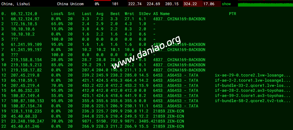 上海 电信 NTT -> 163 地理路径:日本 -> 广东 -> 上海 自治系统路径:AS21859 -> AS2914 -> AS4134 -> AS4812 2-3 0.21ms 23.248.*.* AS21859 日本 东京都 东京 zenlayer.com 4 0.35ms 128.1.*.* AS21859 [ZL-LAX] 日本 东京都 东京 zenlayer.com 5 3.40ms 61.200.*.* AS2914 日本 东京都 东京 gin.ntt.net 6-8 4.24ms 129.250.*.* AS2914 [NTT-BACKBONE] 日本 东京都 东京 gin.ntt.net 9 218.77ms 202.97.*.* AS4134 [CHINANET-BB] 中国 广东 广州 chinatelecom.com.cn 10 221.13ms 202.97.*.* AS4134 [CHINANET-BB] 中国 上海 chinatelecom.com.cn 电信 17 221.16ms 101.226.*.* AS4812 [CHINANET-SH] 中国 上海市 chinatelecom.cn 电信 上海 联通 TATA -> 4837 地理路径:日本 -> 加拿大 -> 美国 -> 北京 -> 上海 自治系统路径:AS21859 -> AS6453 -> AS4837 -> AS140979 2 0.13ms 23.248.*.* AS21859 日本 东京都 东京 zenlayer.com 3-4 1.03ms 128.1.*.* AS21859 [ZL-LAX] 日本 东京都 东京 zenlayer.com 5-7 0.62ms 180.87.*.* AS6453 [TATA-COMMUNICATIONS]日本 东京都 东京 tatacommunications.com 8 112.73ms 180.87.*.* AS6453 [TATA-COMMUNICATIONS]加拿大 魁北克省 蒙特利尔 tatacommunications.com 9-12 115.92ms 64.86.*.* AS6453 美国 加利福尼亚 洛杉矶 tatacommunications.com 13-15 304.48ms 219.158.*.* AS4837 [CU169-BACKBONE] 中国 北京 chinaunicom.cn 联通 22 320.18ms 58.246.*.* AS140979 中国 上海市 chinaunicom.cn 联通 上海 移动 TATA -> CMI 地理路径:日本 -> 上海 自治系统路径:AS21859 -> AS6453 -> AS9808 2 0.33ms 23.248.*.* AS21859 日本 东京都 东京 zenlayer.com 3-4 18.79ms 128.1.*.* AS21859 [ZL-LAX] 日本 东京都 东京 zenlayer.com 5 0.78ms 180.87.*.* AS6453 [TATA-COMMUNICATIONS]日本 东京都 东京 tatacommunications.com 6-7 112.99ms 209.58.*.* AS6453 [TATAC-ARIN] 日本 东京都 东京 tatacommunications.com 8-11 469.97ms 221.183.*.* AS9808 [CMNET] 中国 上海 X-I chinamobileltd.com 移动 15 419.67ms 117.185.*.* AS9808 [CMNET] 中国 上海市 chinamobileltd.com 移动