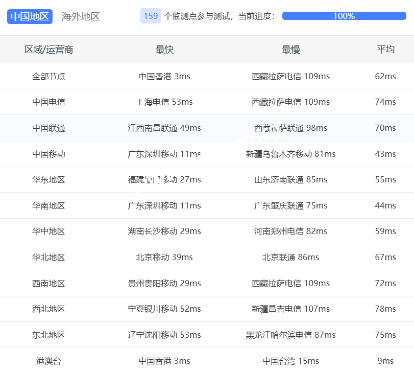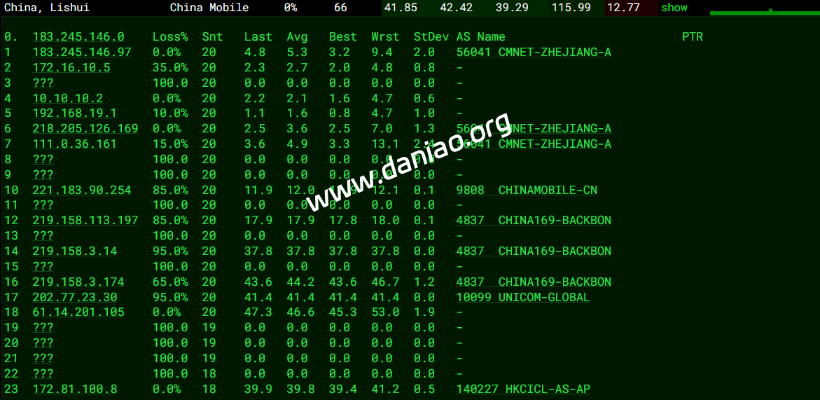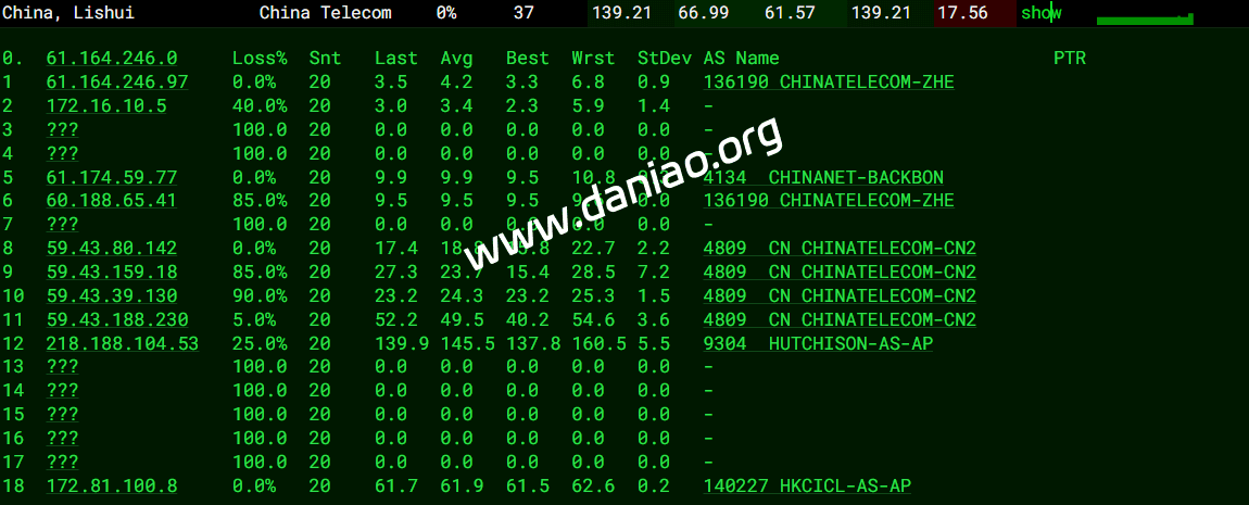广东 电信 AS140227 -> 4837 地理路径:香港 -> 北京 -> 上海 -> 广东 自治系统路径:AS140227 -> AS4837 -> AS4134 1 10.93ms 172.81.*.* AS140227 中国 香港 udc.hk 4 0.97ms 10.1.*.* * RFC1918 10 51.64ms 219.158.*.* AS4837 [CU169-BACKBONE] 中国 北京市 chinaunicom.cn 联通 11 55.07ms 219.158.*.* AS4837 [CU169-BACKBONE] 中国 上海 chinaunicom.cn 联通 12 51.48ms 219.158.*.* AS4837 [CU169-BACKBONE] 中国 广东 广州 chinaunicom.cn 联通 15 58.21ms 202.97.*.* AS4134 [CHINANET-BB] 中国 广东 广州 chinatelecom.com.cn 电信 22 60.27ms 183.47.*.* AS4134 [APNIC-AP] 中国 广东省 广州市 chinatelecom.com.cn 电信 广东 联通 AS140227 -> 4837 地理路径:香港 -> 上海 -> 北京 -> 广东 自治系统路径:AS140227 -> AS4837 -> AS136958 1 7.81ms 172.81.*.* AS140227 中国 香港 udc.hk 3-4 3.16ms 10.2.*.* * RFC1918 10 71.39ms 219.158.*.* AS4837 [CU169-BACKBONE] 中国 上海 chinaunicom.cn 联通 11 57.41ms 219.158.*.* AS4837 [CU169-BACKBONE] 中国 北京市 chinaunicom.cn 联通 20 74.56ms 157.148.*.* AS136958 [UNICOM-GD] 中国 广东省 广州市 chinaunicom.cn 联通 广东 移动 AS140227 -> CMI 地理路径:香港 -> 广东 自治系统路径:AS140227 -> AS9808 -> AS56040 1 8.44ms 172.81.*.* AS140227 中国 香港 udc.hk 4 0.49ms 10.1.*.* * RFC1918 11-12 28.29ms 221.183.*.* AS9808 [CMNET] 中国 广东 广州 X-I chinamobileltd.com 移动 13-14 39.81ms 211.136.*.* AS56040 [CMNET] 中国 广东 广州 gd.10086.cn 移动 15-17 27.38ms 183.235.*.* AS56040 [APNIC-AP] 中国 广东 广州 gd.10086.cn 移动 20 44.99ms 211.139.*.* AS56040 [CMNET] 中国 广东 广州 gd.10086.cn 移动