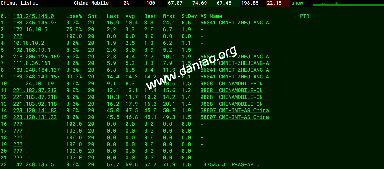 广东 电信 AS137535 -> 4837 地理路径:日本 -> 上海 -> 北京 -> 广东 自治系统路径:AS137535 -> AS4837 -> AS4134 1 3.95ms 142.248.*.* AS137535 日本 东京都 东京 jtti.cc 2-6 12.65ms 10.2.*.* * RFC1918 10 59.70ms 219.158.*.* AS4837 [CU169-BACKBONE] 中国 上海 chinaunicom.cn 联通 11 56.93ms 219.158.*.* AS4837 [CU169-BACKBONE] 中国 北京市 chinaunicom.cn 12 79.40ms 219.158.*.* AS4837 [CU169-BACKBONE] 中国 广东 广州 chinaunicom.cn 联通 22 62.07ms 183.47.*.* AS4134 [APNIC-AP] 中国 广东省 广州市 chinatelecom.com.cn 电信 广东 联通 AS137535 -> 4837 地理路径:日本 -> 上海 -> 广东 自治系统路径:AS137535 -> AS4837 -> AS17816 -> AS136958 1 2.59ms 142.248.*.* AS137535 日本 东京都 东京 jtti.cc 2-6 22.40ms 10.2.*.* * RFC1918 10-11 65.22ms 219.158.*.* AS4837 [CU169-BACKBONE] 中国 上海 X-I chinaunicom.cn 联通 14 78.93ms 221.4.*.* AS17816 [UNICOM-GD] 中国 广东 广州 中国联通 联通 20 101.20ms 157.148.*.* AS136958 [UNICOM-GD] 中国 广东省 广州市 chinaunicom.cn 联通 广东 移动 AS137535 -> 4837 地理路径:日本 -> 上海 -> 广东 自治系统路径:AS137535 -> AS4837 -> AS9808 -> AS56040 1 2.66ms 142.248.*.* AS137535 日本 东京都 东京 jtti.cc 2-6 18.53ms 10.2.*.* * RFC1918 10-12 80.86ms 219.158.*.* AS4837 [CU169-BACKBONE] 中国 上海 X-I chinaunicom.cn 联通 15 64.78ms 219.158.*.* AS4837 [CU169-BACKBONE] 中国 广东 广州 chinaunicom.cn 联通 16 88.61ms 221.183.*.* AS9808 [CMNET] 中国 广东 广州 chinamobileltd.com 移动 18-21 95.83ms 183.235.*.* AS56040 [APNIC-AP] 中国 广东 广州 gd.10086.cn 移动 25 78.12ms 211.139.*.* AS56040 [CMNET] 中国 广东 广州 gd.10086.cn 移动 ================================================================================
