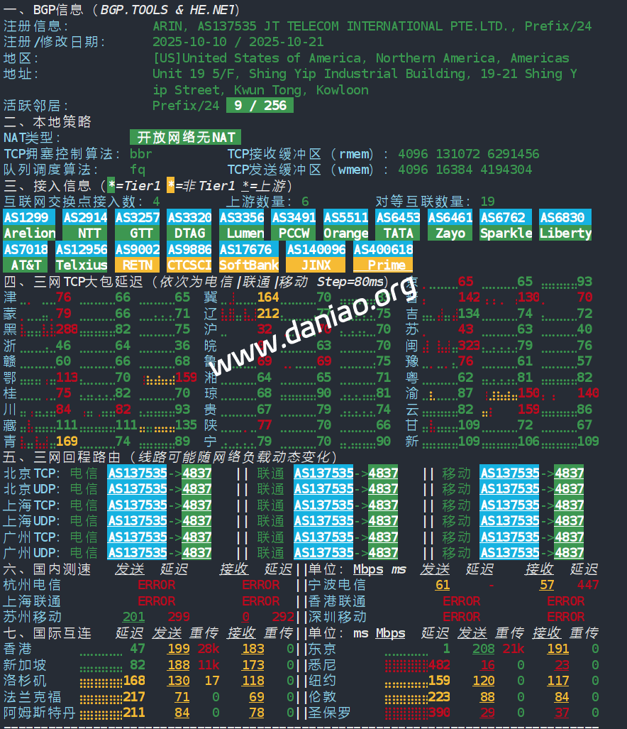 北京 电信 AS137535 -> 4837 地理路径:日本 -> 北京 自治系统路径:AS137535 -> AS4837 -> AS4847 1 1.66ms 142.248.*.* AS137535 日本 东京都 东京 jtti.cc 2-6 12.78ms 10.2.*.* * RFC1918 10-13 57.03ms 219.158.*.* AS4837 [CU169-BACKBONE] 中国 北京市 chinaunicom.cn 联通 17 59.45ms 36.112.*.* AS4847 中国 北京 bj.189.cn 18-19 61.56ms 219.141.*.* AS4847 [CHINATELECOM-BJ] 中国 北京 bj.189.cn 20 76.30ms 106.37.*.* AS4847 [CHINANET-HN] 中国 北京 bj.189.cn 北京 联通 AS137535 -> 4837 地理路径:日本 -> 上海 -> 北京 自治系统路径:AS137535 -> AS4837 -> AS4808 1 1.84ms 142.248.*.* AS137535 日本 东京都 东京 jtti.cc 2-6 17.15ms 10.2.*.* * RFC1918 10-12 58.10ms 219.158.*.* AS4837 [CU169-BACKBONE] 中国 上海 X-I chinaunicom.cn 联通 14 69.31ms 124.64.*.* AS4808 [UNICOM-BJ] 中国 北京 北京 www.bbn.com.cn 15 82.31ms 61.148.*.* AS4808 [UNICOM-CN] 中国 北京市 www.bbn.com.cn 联通 19 61.94ms 221.222.*.* AS4808 [UNICOM-BJ] 中国 北京 海淀 www.bbn.com.cn 北京 移动 AS137535 -> 4837 地理路径:日本 -> 上海 -> 北京 自治系统路径:AS137535 -> AS4837 -> AS56048 1 1.90ms 142.248.*.* AS137535 日本 东京都 东京 jtti.cc 2-6 13.07ms 10.2.*.* * RFC1918 10-11 78.89ms 219.158.*.* AS4837 [CU169-BACKBONE] 中国 上海 chinaunicom.cn 联通 13-14 59.97ms 219.158.*.* AS4837 [CU169-BACKBONE] 中国 北京 chinaunicom.cn 联通 15 74.51ms 219.158.*.* AS4837 [CU169-BACKBONE] 中国 香港 chinaunicom.cn 18-21 76.04ms 211.136.*.* AS56048 [CMNET] 中国 北京 bj.10086.cn 移动 23 55.70ms 211.136.*.* AS56048 [CMNET] 中国 北京 bj.10086.cn 移动