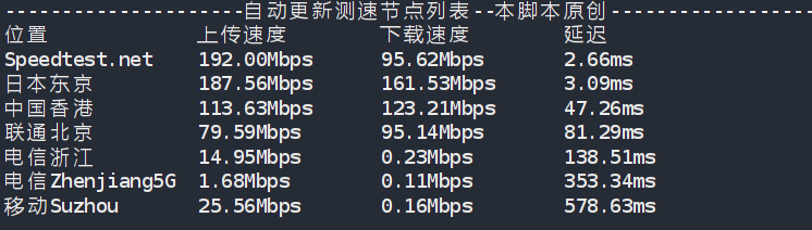 ---------------------------------------------------------------------- CPU Model : Intel(R) Xeon(R) Platinum 8168 CPU @ 2.70GHz CPU Cores : 1 @ 2693.634 MHz CPU Cache : 16384 KB AES-NI : ✓ Enabled VM-x/AMD-V : ✓ Enabled Total Disk : 49.1 GB (1.5 GB Used) Total RAM : 942.3 MB (244.7 MB Used) System Uptime : 0 days, 22 hour 17 min Load Average : 0.00, 0.14, 0.22 OS : Debian GNU/Linux 12 (bookworm) Arch : x86_64 (64 Bit) Kernel : 6.1.0-38-amd64 TCP Congestion Ctrl: bbr Virtualization : KVM IPv4/IPv6 : ✓ Online / ✗ Offline Organization : AS137535 JT TELECOM INTERNATIONAL PTE.LTD. Location : Tokyo / JP Region : Tokyo ---------------------------------------------------------------------- I/O Speed(1st run) : 757 MB/s I/O Speed(2nd run) : 868 MB/s I/O Speed(3rd run) : 660 MB/s I/O Speed(average) : 761.7 MB/s ---------------------------------------------------------------------- Node Name Upload Speed Download Speed Latency Speedtest.net 199.56 Mbps 191.31 Mbps 2.30 ms Los Angeles, US 209.59 Mbps 185.25 Mbps 110.55 ms Dallas, US 207.92 Mbps 183.98 Mbps 141.10 ms Montreal, CA 204.68 Mbps 190.89 Mbps 158.37 ms Paris, FR 201.54 Mbps 201.86 Mbps 209.47 ms Amsterdam, NL 202.21 Mbps 199.13 Mbps 222.87 ms Suzhou, CN Test failed Ningbo, CN Test failed Hong Kong, CN 201.60 Mbps 193.30 Mbps 47.18 ms Singapore, SG 156.66 Mbps 182.57 Mbps 87.32 ms Taipei, CN 200.75 Mbps 200.93 Mbps 32.23 ms Tokyo, JP 199.31 Mbps 190.67 Mbps 2.37 ms ----------------------------------------------------------------------