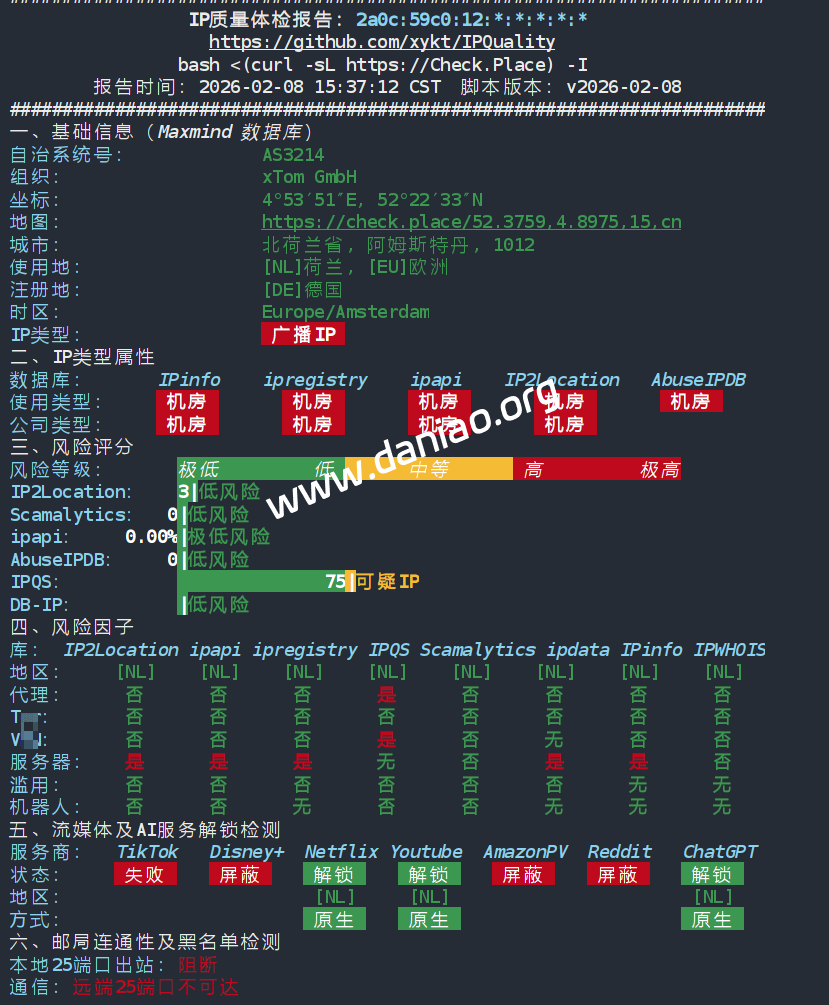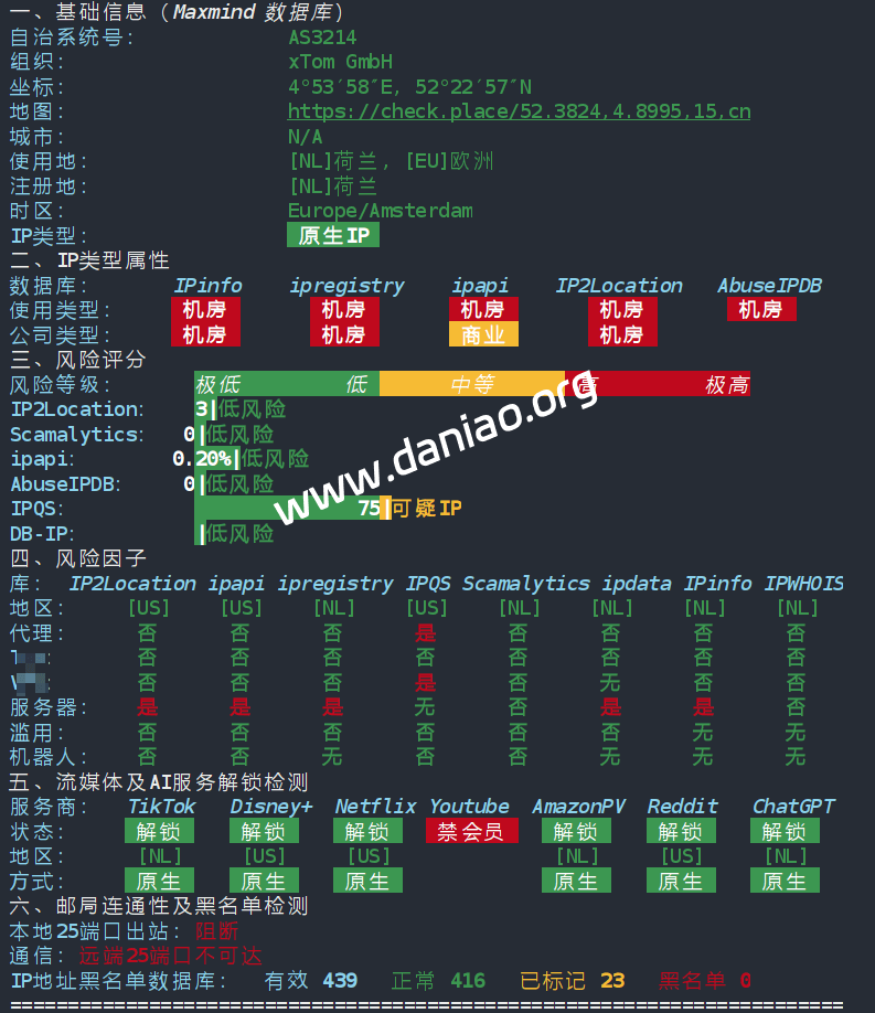 IP为荷兰原生IP,不过解锁不咋地,具体的自己看上面的数据,特地放了2张图可以对比下。
