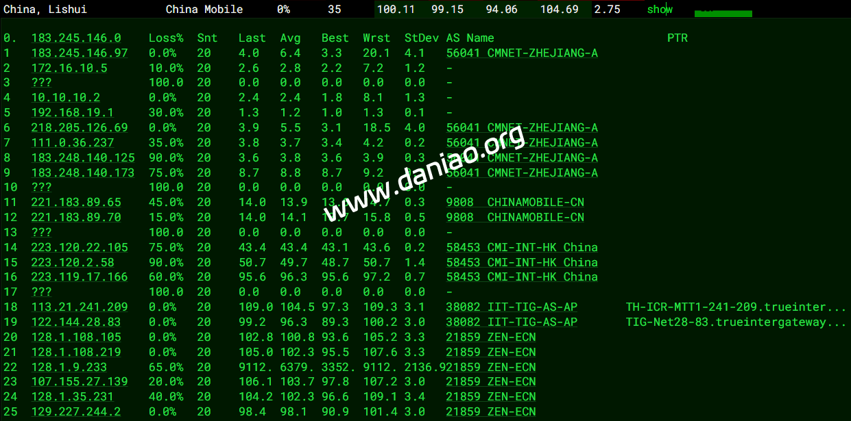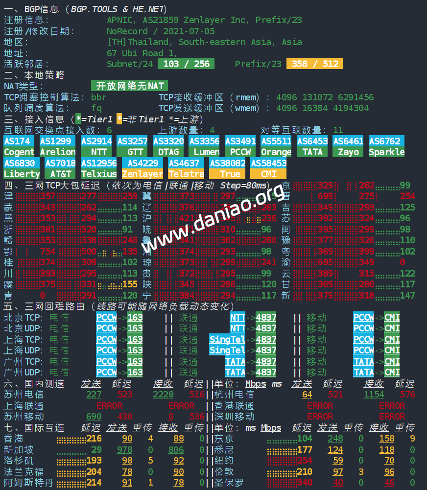 北京 移动 PCCW -> CMI 地理路径:泰国 -> 新加坡 -> 北京 自治系统路径:AS21859 -> AS4229 -> AS3491 -> AS58453 -> AS9808 -> AS56048 2-6 1.91ms 128.1.*.* AS21859 泰国 曼谷都会区 曼谷 zenlayer.com 7-8 0.90ms 98.98.*.* AS4229 新加坡 zenlayer.com 11 27.73ms 63.223.*.* AS3491 [PCCW-BACKBONE] 新加坡 pccwglobal.com 12 56.78ms 223.121.*.* AS58453 [CMI-INT] 新加坡 cmi.chinamobile.com 移动 14 87.44ms 223.120.*.* AS58453 [CMI-INT] 中国 北京 cmi.chinamobile.com 移动 15-16 91.12ms 221.183.*.* AS9808 [CMNET] 中国 北京 X-I chinamobileltd.com 移动 19-22 102.07ms 211.136.*.* AS56048 [CMNET] 中国 北京 bj.10086.cn 移动 24 94.63ms 211.136.*.* AS56048 [CMNET] 中国 北京 bj.10086.cn 移动 上海 移动 PCCW -> CMI 地理路径:泰国 -> 新加坡 -> 美国 -> 上海 自治系统路径:AS21859 -> AS4229 -> AS3491 -> AS58453 -> AS9808 2-6 1.98ms 128.1.*.* AS21859 泰国 曼谷都会区 曼谷 zenlayer.com 7-9 0.80ms 98.98.*.* AS4229 新加坡 zenlayer.com 11-12 198.15ms 63.223.*.* AS3491 [PCCW-BACKBONE] 美国 加利福尼亚 洛杉矶 pccwglobal.com 13 208.06ms 63.220.*.* AS3491 美国 加利福尼亚 洛杉矶 pccwglobal.com 14 203.49ms 223.120.*.* AS58453 [CMI-INT] 美国 加利福尼亚 洛杉矶 cmi.chinamobile.com 移动 15-17 233.68ms 221.183.*.* AS9808 [CMNET] 中国 上海 X-I chinamobileltd.com 移动 22 232.97ms 117.185.*.* AS9808 [CMNET] 中国 上海市 chinamobileltd.com 移动 广东 移动 TATA -> CMI 地理路径:俄罗斯 -> 泰国 -> 新加坡 -> 香港 -> 广东 自治系统路径:AS49505 -> AS21859 -> AS38082 -> AS6453 -> AS58453 -> AS9808 -> AS56040 1 18.10ms 5.8.*.* AS49505 俄罗斯 列宁格勒州 圣彼得堡 selectel.com 2-6 3.05ms 128.1.*.* AS21859 泰国 曼谷都会区 曼谷 zenlayer.com 7-9 1.23ms 122.144.*.* AS38082 [TRUEINTERNET-TH] 泰国 曼谷 truecorp.co.th 10-12 55.27ms 180.87.*.* AS6453 [TATA-COMMUNICATIONS]新加坡 tatacommunications.com 13-14 63.13ms 223.120.*.* AS58453 [CMI-INT] 新加坡 cmi.chinamobile.com 移动 15-16 58.26ms 223.120.*.* AS58453 [CMI-INT] 中国 香港 cmi.chinamobile.com 移动 17 85.29ms 221.183.*.* AS9808 [CMNET] 中国 广东 广州 I-C chinamobileltd.com 移动 18-23 94.14ms 183.235.*.* AS56040 [APNIC-AP] 中国 广东 深圳 gd.10086.cn 移动 25 108.89ms 211.139.*.* AS56040 [CMNET] 中国 广东 广州 gd.10086.cn 移动