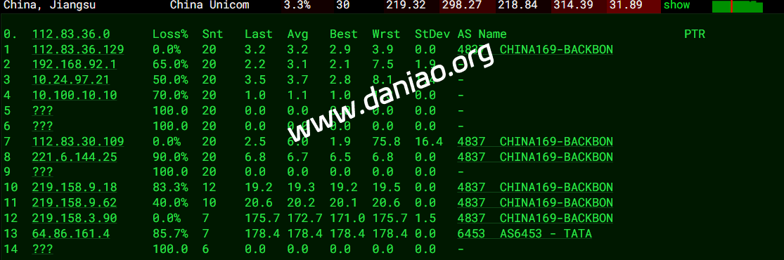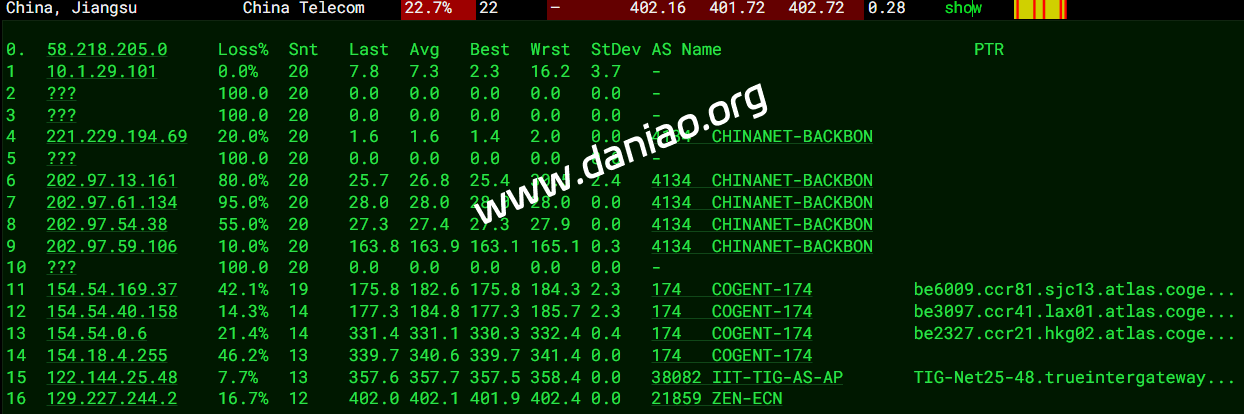 北京 电信 PCCW -> 163 地理路径:泰国 -> 新加坡 -> 德国 -> 上海 -> 北京 自治系统路径:AS21859 -> AS4229 -> AS3491 -> AS4134 -> AS4847 2-6 8.62ms 128.1.*.* AS21859 泰国 曼谷都会区 曼谷 zenlayer.com 7-8 0.88ms 98.98.*.* AS4229 新加坡 zenlayer.com 12 190.97ms 63.218.*.* AS3491 [PCCW-BACKBONE] 德国 黑森 美因河畔法兰克福 pccwglobal.com 13 210.91ms 81.173.*.* AS4134 德国 黑森州 美因河畔法兰克福 chinatelecom.com.cn 电信 14 329.10ms 202.97.*.* AS4134 [CHINANET-BB] 中国 上海 chinatelecom.com.cn 电信 15-16 328.40ms 202.97.*.* AS4134 [CHINANET-BB] 中国 北京 chinatelecom.com.cn 电信 18-20 323.78ms 219.141.*.* AS4847 [CHINATELECOM-BJ] 中国 北京 bj.189.cn 21 338.53ms 106.37.*.* AS4847 [CHINANET-HN] 中国 北京 bj.189.cn 上海 电信 PCCW -> 163 地理路径:俄罗斯 -> 泰国 -> 新加坡 -> 德国 -> 江苏 -> 上海 自治系统路径:AS49505 -> AS21859 -> AS4229 -> AS3491 -> AS4134 -> AS4812 1 10.76ms 5.8.*.* AS49505 俄罗斯 列宁格勒州 圣彼得堡 selectel.com 2-6 2.30ms 128.1.*.* AS21859 泰国 曼谷都会区 曼谷 zenlayer.com 7-9 0.98ms 98.98.*.* AS4229 新加坡 zenlayer.com 12 183.63ms 63.218.*.* AS3491 [PCCW-BACKBONE] 德国 黑森 美因河畔法兰克福 pccwglobal.com 13 214.27ms 81.173.*.* AS4134 德国 黑森州 美因河畔法兰克福 chinatelecom.com.cn 电信 14 355.58ms 202.97.*.* AS4134 [CHINANET-BB] 中国 江苏 无锡 chinatelecom.com.cn 电信 15-16 373.33ms 202.97.*.* AS4134 [CHINANET-BB] 中国 上海 I-C chinatelecom.com.cn 电信 23 367.73ms 101.226.*.* AS4812 [CHINANET-SH] 中国 上海市 chinatelecom.cn 电信 广东 电信 PCCW -> 163 地理路径:俄罗斯 -> 泰国 -> 新加坡 -> 德国 -> 北京 -> 广东 自治系统路径:AS49505 -> AS21859 -> AS4229 -> AS3491 -> AS4134 1 15.22ms 5.8.*.* AS49505 俄罗斯 列宁格勒州 圣彼得堡 selectel.com 2-6 2.37ms 128.1.*.* AS21859 泰国 曼谷都会区 曼谷 zenlayer.com 7-8 0.94ms 98.98.*.* AS4229 新加坡 zenlayer.com 12 190.88ms 63.218.*.* AS3491 [PCCW-BACKBONE] 德国 黑森 美因河畔法兰克福 pccwglobal.com 13 368.74ms 81.173.*.* AS4134 德国 黑森州 美因河畔法兰克福 chinatelecom.com.cn 电信 14 362.11ms 202.97.*.* AS4134 [CHINANET-BB] 中国 北京 chinatelecom.com.cn 电信 15-16 371.23ms 202.97.*.* AS4134 [CHINANET-BB] 中国 广东 广州 chinatelecom.com.cn 17-19 361.68ms 113.96.*.* AS4134 [CHINANET-GD] 中国 广东 广州 chinatelecom.com.cn 电信 23 371.27ms 183.47.*.* AS4134 [APNIC-AP] 中国 广东省 广州市 chinatelecom.com.cn 电信