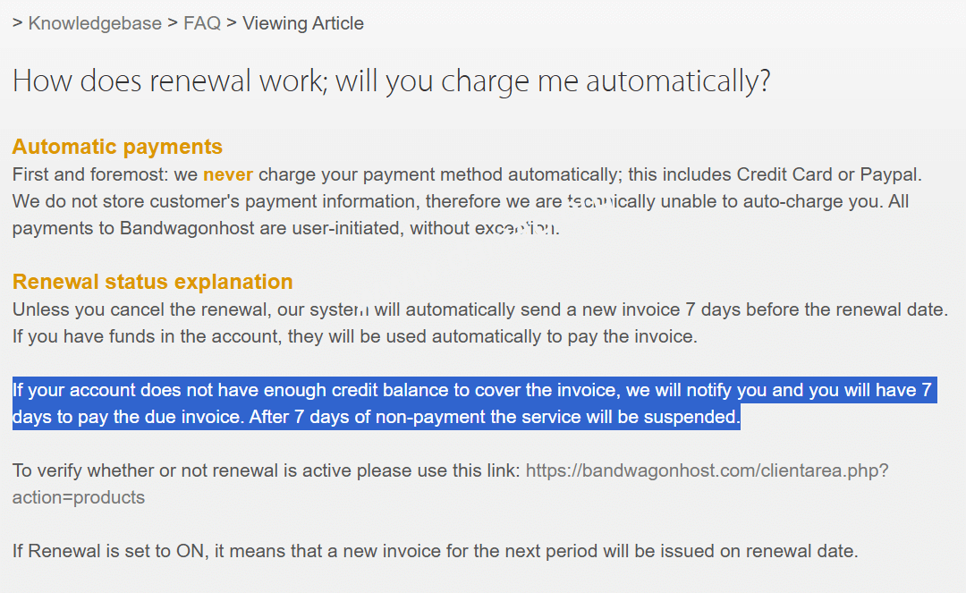 If your account does not have enough credit balance to cover the invoice, we will notify you and you will have 7 days to pay the due invoice. After 7 days of non-payment the service will be suspended.