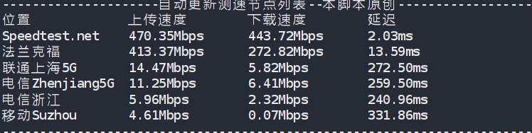 ---------------------------------------------------------------------- Node Name Upload Speed Download Speed Latency Speedtest.net 498.24 Mbps 476.61 Mbps 1.17 ms Los Angeles, US 498.96 Mbps 502.23 Mbps 146.13 ms Dallas, US 537.29 Mbps 475.73 Mbps 114.29 ms Montreal, CA 8.56 Mbps 304.63 Mbps 109.81 ms Paris, FR 497.09 Mbps 478.47 Mbps 1.95 ms Amsterdam, NL 501.33 Mbps 476.78 Mbps 9.56 ms Suzhou, CN 394.25 Mbps 472.07 Mbps 252.12 ms Ningbo, CN 0.42 Mbps 419.78 Mbps 252.96 ms Hong Kong, CN 305.14 Mbps 445.29 Mbps 306.84 ms Singapore, SG 488.41 Mbps 375.63 Mbps 236.12 ms Taipei, CN 533.04 Mbps 491.23 Mbps 189.32 ms Tokyo, JP 457.13 Mbps 410.78 Mbps 255.62 ms ----------------------------------------------------------------------