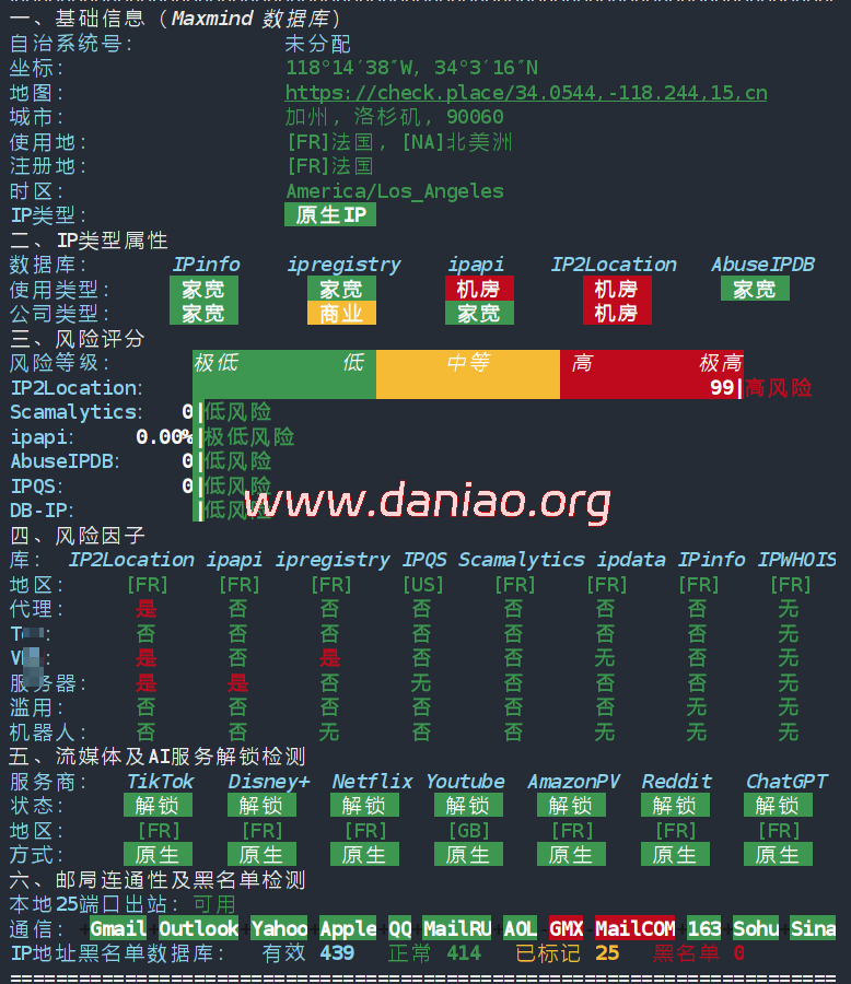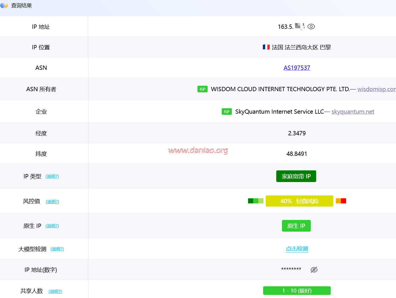 IP为法国原生IP,具有双ISP属性。
