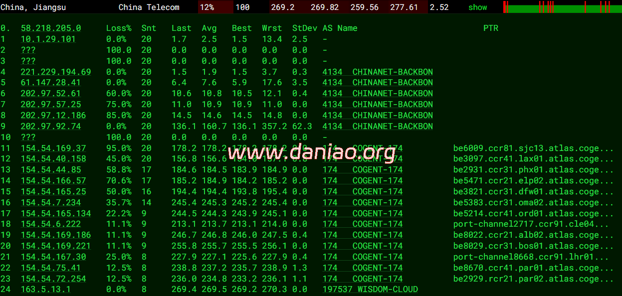 北京 电信 Cogent -> 163 地理路径:法国 -> 德国 -> 北京 自治系统路径:AS197537 -> AS174 -> AS4134 -> AS4847 1 0.36ms 163.5.*.* AS197537 法国 法兰西岛大区 巴黎 wisdomisp.com 2 0.77ms 149.6.*.* AS174 [COGENT-149] 法国 法兰西岛大区 巴黎 cogentco.com 3 1.24ms 154.54.*.* AS174 [COGENT-BONE] 法国 法兰西岛大区 巴黎 cogentco.com 4-5 10.52ms 154.54.*.* AS174 [COGENT-BONE] 德国 黑森 美因河畔法兰克福 cogentco.com 6 48.66ms 149.11.*.* AS174 [COGENT-149] 德国 黑森 美因河畔法兰克福 cogentco.com 7-9 228.20ms 202.97.*.* AS4134 [CHINANET-BB] 中国 北京 X-I chinatelecom.com.cn 电信 11-13 242.38ms 219.141.*.* AS4847 [CHINATELECOM-BJ] 中国 北京 bj.189.cn 14 249.06ms 106.37.*.* AS4847 [CHINANET-HN] 中国 北京 bj.189.cn 上海 电信 Cogent -> 163 地理路径:法国 -> 德国 -> 上海 自治系统路径:AS197537 -> AS174 -> AS4134 -> AS4812 1 0.38ms 163.5.*.* AS197537 法国 法兰西岛大区 巴黎 wisdomisp.com 2 1.59ms 149.6.*.* AS174 [COGENT-149] 法国 法兰西岛大区 巴黎 cogentco.com 3 1.39ms 154.54.*.* AS174 [COGENT-BONE] 法国 法兰西岛大区 巴黎 cogentco.com 4-5 11.46ms 154.54.*.* AS174 [COGENT-BONE] 德国 黑森 美因河畔法兰克福 cogentco.com 6 22.22ms 149.11.*.* AS174 [COGENT-149] 德国 黑森 美因河畔法兰克福 cogentco.com 7-9 241.69ms 202.97.*.* AS4134 [CHINANET-BB] 中国 上海 chinatelecom.com.cn 电信 16 249.26ms 101.226.*.* AS4812 [CHINANET-SH] 中国 上海市 chinatelecom.cn 电信 广东 电信 Cogent -> 163 地理路径:法国 -> 德国 -> 北京 -> 广东 自治系统路径:AS197537 -> AS174 -> AS4134 1 0.49ms 163.5.*.* AS197537 法国 法兰西岛大区 巴黎 wisdomisp.com 2 5.51ms 149.6.*.* AS174 [COGENT-149] 法国 法兰西岛大区 巴黎 cogentco.com 3 2.29ms 154.54.*.* AS174 [COGENT-BONE] 法国 法兰西岛大区 巴黎 cogentco.com 4-5 11.03ms 154.54.*.* AS174 [COGENT-BONE] 德国 黑森 美因河畔法兰克福 cogentco.com 6 19.49ms 149.11.*.* AS174 [COGENT-149] 德国 黑森 美因河畔法兰克福 cogentco.com 7 266.16ms 202.97.*.* AS4134 [CHINANET-BB] 中国 北京 chinatelecom.com.cn 电信 8-9 261.02ms 202.97.*.* AS4134 [CHINANET-BB] 中国 广东 广州 chinatelecom.com.cn 12 256.10ms 113.108.*.* AS4134 [CHINANET-GD] 中国 广东省 广州市 chinatelecom.com.cn 电信 16 269.52ms 183.47.*.* AS4134 [APNIC-AP] 中国 广东省 广州市 chinatelecom.com.cn 电信