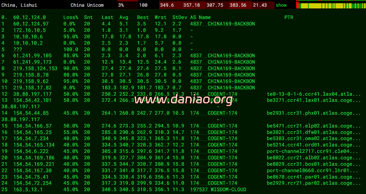 北京 联通 Cogent -> 4837 地理路径:法国 -> 德国 -> 北京 自治系统路径:AS197537 -> AS174 -> AS4837 -> AS4808 1 0.17ms 163.5.*.* AS197537 法国 法兰西岛大区 巴黎 wisdomisp.com 2 0.52ms 149.6.*.* AS174 [COGENT-149] 法国 法兰西岛大区 巴黎 cogentco.com 3 17.78ms 154.54.*.* AS174 [COGENT-BONE] 法国 法兰西岛大区 巴黎 cogentco.com 4-5 10.84ms 154.54.*.* AS174 [COGENT-BONE] 德国 黑森 美因河畔法兰克福 cogentco.com 6 282.59ms 149.11.*.* AS174 [COGENT-149] 德国 黑森州 美因河畔法兰克福 cogentco.com 7-8 289.77ms 219.158.*.* AS4837 [CU169-BACKBONE] 中国 北京 X-I chinaunicom.cn 联通 10 318.44ms 125.33.*.* AS4808 [UNICOM-BJ] 中国 北京 www.bbn.com.cn 联通 11 314.96ms 61.148.*.* AS4808 [UNICOM-CN] 中国 北京市 www.bbn.com.cn 联通 15 317.49ms 221.222.*.* AS4808 [UNICOM-BJ] 中国 北京 海淀 www.bbn.com.cn 上海 联通 Cogent -> 4837 地理路径:法国 -> 德国 -> 广东 -> 上海 自治系统路径:AS197537 -> AS174 -> AS4837 -> AS140979 1 1.38ms 163.5.*.* AS197537 法国 法兰西岛大区 巴黎 wisdomisp.com 2 0.70ms 149.6.*.* AS174 [COGENT-149] 法国 法兰西岛大区 巴黎 cogentco.com 3 1.44ms 154.54.*.* AS174 [COGENT-BONE] 法国 法兰西岛大区 巴黎 cogentco.com 4-5 10.71ms 154.54.*.* AS174 [COGENT-BONE] 德国 黑森 美因河畔法兰克福 cogentco.com 6 229.82ms 149.11.*.* AS174 [COGENT-149] 德国 黑森州 美因河畔法兰克福 cogentco.com 7-8 241.30ms 219.158.*.* AS4837 [CU169-BACKBONE] 中国 广东 广州 chinaunicom.cn 联通 17 340.82ms 58.246.*.* AS140979 中国 上海市 chinaunicom.cn 联通 广东 联通 Cogent -> 4837 地理路径:法国 -> 德国 -> 广东 自治系统路径:AS197537 -> AS174 -> AS4837 -> AS17816 -> AS136958 1 0.43ms 163.5.*.* AS197537 法国 法兰西岛大区 巴黎 wisdomisp.com 2 2.01ms 149.6.*.* AS174 [COGENT-149] 法国 法兰西岛大区 巴黎 cogentco.com 3 1.48ms 154.54.*.* AS174 [COGENT-BONE] 法国 法兰西岛大区 巴黎 cogentco.com 4-5 12.81ms 154.54.*.* AS174 [COGENT-BONE] 德国 黑森 美因河畔法兰克福 cogentco.com 6 224.58ms 149.11.*.* AS174 [COGENT-149] 德国 黑森州 美因河畔法兰克福 cogentco.com 7-9 229.63ms 219.158.*.* AS4837 [CU169-BACKBONE] 中国 广东 广州 chinaunicom.cn 联通 10 250.36ms 120.80.*.* AS17816 [APNIC-AP] 中国 广东 广州 China Unicom IP network China169 Guangdong province 16 251.44ms 157.148.*.* AS136958 [UNICOM-GD] 中国 广东省 广州市 chinaunicom.cn 联通