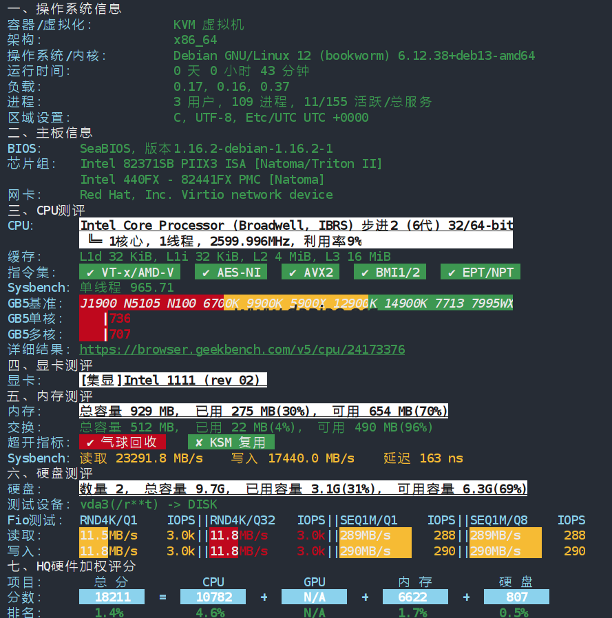 CPU Model : Intel Core Processor (Broadwell, IBRS) CPU Cores : 1 @ 2599.996 MHz CPU Cache : 16384 KB AES-NI : ✓ Enabled VM-x/AMD-V : ✓ Enabled Total Disk : 10.3 GB (1.8 GB Used) Total RAM : 929.0 MB (220.6 MB Used) Total Swap : 512.0 MB (19.0 MB Used) System Uptime : 0 days, 1 hour 48 min Load Average : 0.11, 0.10, 0.09 OS : Debian GNU/Linux 13 (trixie) Arch : x86_64 (64 Bit) Kernel : 6.12.38+deb13-amd64 TCP Congestion Ctrl: bbr Virtualization : KVM IPv4/IPv6 : ✓ Online / ✗ Offline Organization : AS197537 WISDOM CLOUD INTERNET TECHNOLOGY PTE. LTD. Location : Paris / FR Region : Île-de-France ---------------------------------------------------------------------- I/O Speed(1st run) : 298 MB/s I/O Speed(2nd run) : 299 MB/s I/O Speed(3rd run) : 299 MB/s I/O Speed(average) : 298.7 MB/s
