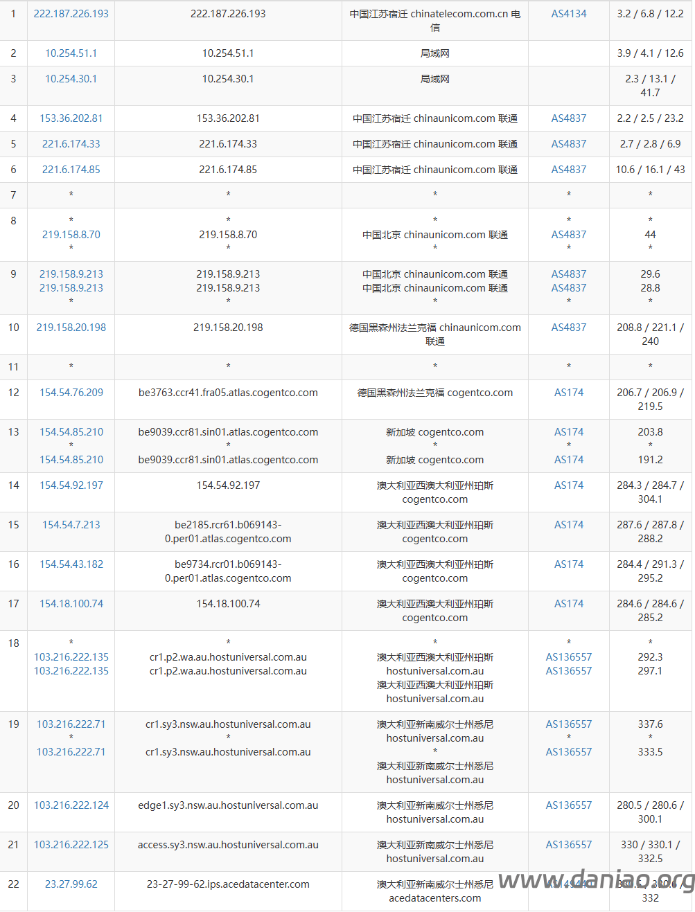 联通回程cogent,地理路径:澳大利亚 -> 美国 -> 国内,广东联通回程澳大利亚 -> 新加坡 -> 美国 -> 国内。