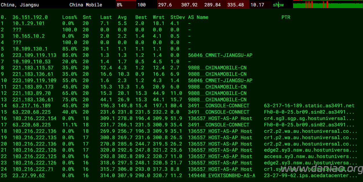 上海 电信 Cogent -> 163 地理路径:澳大利亚 -> 美国 -> 上海 自治系统路径:AS136557 -> AS174 -> AS4134 -> AS4812 1-2 0.25ms 103.216.*.* AS136557 [HOST-AU] 澳大利亚 新南威尔士州 悉尼 hostuniversal.com.au 3 0.27ms 103.216.*.* AS136557 [HOST-AU] 美国 密苏里州 堪萨斯城 hostuniversal.com.au 6-7 133.45ms 154.54.*.* AS174 [COGENT-BONE] 美国 俄勒冈 波特兰 cogentco.com 8 147.54ms 154.54.*.* AS174 [COGENT-BONE] 美国 科罗拉多 丹佛 cogentco.com 9-10 149.13ms 154.54.*.* AS174 [COGENT-BONE] 美国 加利福尼亚 圣何塞 cogentco.com 12-13 288.66ms 202.97.*.* AS4134 [CHINANET-BB] 中国 上海 chinatelecom.com.cn 电信 14-15 304.98ms 101.95.*.* AS4812 [CHINANET-SH] 中国 上海 chinatelecom.cn 电信 20 301.64ms 101.226.*.* AS4812 [CHINANET-SH] 中国 上海市 chinatelecom.cn 电信 上海 联通 Unknown -> NoData 地理路径:澳大利亚 -> 新加坡 自治系统路径:AS136557 -> AS2914 1-3 0.32ms 103.216.*.* AS136557 [HOST-AU] 澳大利亚 新南威尔士州 悉尼 hostuniversal.com.au 5-6 46.03ms 103.216.*.* AS136557 [HOST-AU] 澳大利亚 欣德马什 hostuniversal.com.au 7 92.04ms 103.216.*.* AS136557 [HOST-AU] 新加坡 新南威尔士州 悉尼 hostuniversal.com.au 8 92.53ms 116.51.*.* AS2914 [NTT-GIN] 新加坡 gin.ntt.net 9 219.38ms 129.250.*.* AS2914 [NTT-BACKBONE] 新加坡 gin.ntt.net 上海 移动 Cogent -> CMI 地理路径:澳大利亚 -> 美国 -> 上海 自治系统路径:AS136557 -> AS174 -> AS58453 -> AS9808 1-2 0.25ms 103.216.*.* AS136557 [HOST-AU] 澳大利亚 新南威尔士州 悉尼 hostuniversal.com.au 3 0.30ms 103.216.*.* AS136557 [HOST-AU] 美国 密苏里州 堪萨斯城 hostuniversal.com.au 6-7 133.63ms 154.54.*.* AS174 [COGENT-BONE] 美国 俄勒冈 波特兰 cogentco.com 8-11 147.76ms 154.54.*.* AS174 [COGENT-BONE] 美国 加利福尼亚 洛杉矶 cogentco.com 12-13 158.27ms 38.104.*.* AS174 美国 加利福尼亚 洛杉矶 cogentco.com 14 158.50ms 223.120.*.* AS58453 [CMI-INT] 美国 加利福尼亚 洛杉矶 cmi.chinamobile.com 移动 15 273.76ms 223.120.*.* AS58453 [CMI-INT] 中国 上海 cmi.chinamobile.com 移动 16-18 266.86ms 221.183.*.* AS9808 [CMNET] 中国 上海 X-I chinamobileltd.com 移动 21 276.60ms 117.185.*.* AS9808 [CMNET] 中国 上海市 chinamobileltd.com 移动
