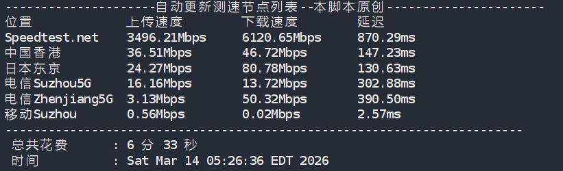 ---------------------------------------------------------------------- Node Name Upload Speed Download Speed Latency Speedtest.net 9085.82 Mbps 9032.35 Mbps 0.28 ms Los Angeles, US 409.88 Mbps 2631.02 Mbps 160.51 ms Dallas, US 356.02 Mbps 434.89 Mbps 182.31 ms Montreal, CA 317.58 Mbps 501.18 Mbps 197.33 ms Paris, FR 265.16 Mbps 633.11 Mbps 238.33 ms Amsterdam, NL 249.64 Mbps 676.67 Mbps 247.55 ms Suzhou, CN 44.38 Mbps 1364.33 Mbps 294.82 ms Ningbo, CN 9.30 Mbps 1159.25 Mbps 313.83 ms Hong Kong, CN 3.29 Mbps 3.78 Mbps 212.19 ms Singapore, SG 700.91 Mbps 4355.14 Mbps 94.25 ms Taipei, CN 507.04 Mbps 3318.50 Mbps 128.60 ms Tokyo, JP 340.14 Mbps 1050.39 Mbps 189.13 ms ----------------------------------------------------------------------