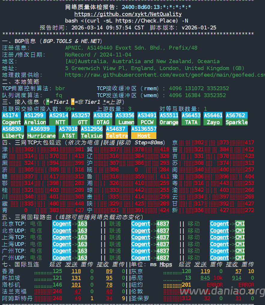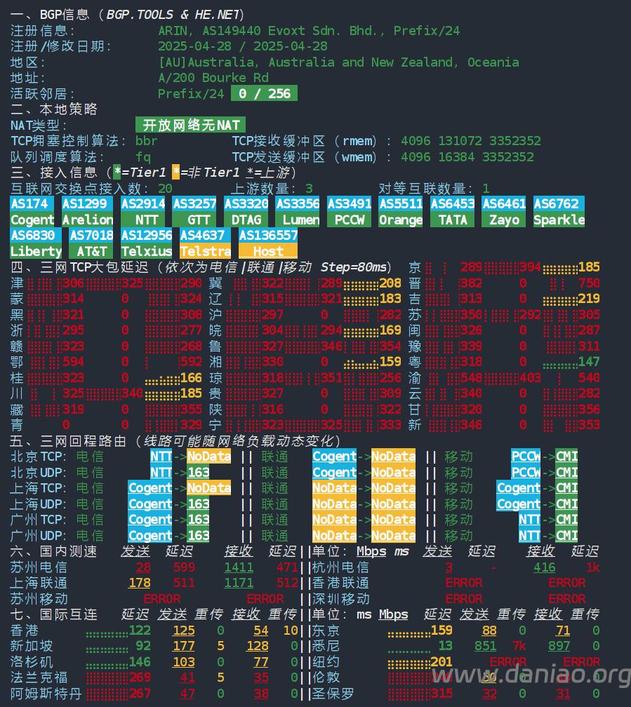 北京 电信 Cogent -> 163 地理路径:马来西亚 -> 澳大利亚 -> 美国 -> 北京 自治系统路径:AS149440 -> AS136557 -> AS174 -> AS4134 -> AS23724 1 0.28ms 2400:8d60:13:*:*:*:*:* AS149440 马来西亚 evoxt.com 2-3 0.37ms 2406:d500:6:*:*:*:*:* AS136557 澳大利亚 新南威尔士州 悉尼 hostuniversal.com.au 4 0.42ms 2402:4480:8002:*:*:*:*:* AS174 中国 香港 cogentco.com 5 1.16ms 2402:4480:8002:*:*:*:*:* AS174 澳大利亚 新南威尔士州 悉尼 cogentco.com 7-8 134.20ms 2001:550:0:*:*:*:*:* AS174 美国 俄勒冈 波特兰 cogentco.com 9 147.80ms 2001:550:0:*:*:*:*:* AS174 美国 科罗拉多 丹佛 cogentco.com 11-12 295.25ms 240e:0:a:*:*:*:*:* AS4134 中国 北京 chinatelecom.com.cn 电信 13 310.34ms 240e:0:a:*:*:*:*:* AS4134 中国 chinatelecom.com.cn 电信 15-16 302.78ms 240e:0:9000:*:*:*:*:* AS23724 中国 北京 bjtelecom.net 电信 17 312.60ms 240e:904:800:*:*:*:*:* AS23724 中国 北京市 bjtelecom.net 电信 北京 联通 Cogent -> 4837 地理路径:马来西亚 -> 澳大利亚 -> 香港 -> 美国 -> 北京 自治系统路径:AS149440 -> AS136557 -> AS174 -> AS4837 -> AS4808 1 0.32ms 2400:8d60:13:*:*:*:*:* AS149440 马来西亚 evoxt.com 2-4 0.38ms 2406:d500:6:*:*:*:*:* AS136557 澳大利亚 新南威尔士州 悉尼 hostuniversal.com.au 5 0.51ms 2402:4480:8002:*:*:*:*:* AS174 中国 香港 cogentco.com 7-8 134.35ms 2001:550:0:*:*:*:*:* AS174 美国 俄勒冈 波特兰 cogentco.com 9-10 148.60ms 2001:550:0:*:*:*:*:* AS174 美国 加利福尼亚 圣何塞 cogentco.com 13-15 401.05ms 2408:8000:2:*:*:*:*:* AS4837 中国 北京 chinaunicom.cn 联通 16-18 359.60ms 2408:8000:1100:*:*:*:*:* AS4808 中国 北京 www.bbn.com.cn 联通 19 353.39ms 2408:8706:0:*:*:*:*:* AS4808 中国 北京市 www.bbn.com.cn 联通 北京 移动 Cogent -> CMI 地理路径:马来西亚 -> 澳大利亚 -> 香港 -> 新加坡 -> 法国 -> 英国 -> 上海 -> 北京 自治系统路径:AS149440 -> AS136557 -> AS174 -> AS58453 -> AS9808 1 0.34ms 2400:8d60:13:*:*:*:*:* AS149440 马来西亚 evoxt.com 2-4 0.39ms 2406:d500:6:*:*:*:*:* AS136557 澳大利亚 新南威尔士州 悉尼 hostuniversal.com.au 5 0.39ms 2402:4480:8002:*:*:*:*:* AS174 中国 香港 cogentco.com 6-7 93.63ms 2001:550:0:*:*:*:*:* AS174 新加坡 cogentco.com 8 232.14ms 2001:550:0:*:*:*:*:* AS174 法国 普罗旺斯-阿尔卑斯-蓝色海岸大区 马赛 cogentco.com 9-10 254.13ms 2001:550:0:*:*:*:*:* AS174 英国 英格兰 斯劳 cogentco.com 13 268.64ms 2402:4f00:2000:*:*:*:*:* AS58453 中国 上海 cmi.chinamobile.com 14-17 361.47ms 2409:8080:0:*:*:*:*:* AS9808 中国 上海 chinamobileltd.com 移动 18-20 439.12ms 2409:8080:0:*:*:*:*:* AS9808 中国 北京 chinamobileltd.com 移动 21 408.46ms 2409:8c00:7821:*:*:*:*:* AS9808 中国 北京 北京 chinamobileltd.com 上海 电信 Cogent -> 163 地理路径:马来西亚 -> 澳大利亚 -> 香港 -> 美国 -> 上海 自治系统路径:AS149440 -> AS136557 -> AS174 -> AS4134 -> AS4812 -> AS4811 1 0.43ms 2400:8d60:13:*:*:*:*:* AS149440 马来西亚 evoxt.com 2-3 0.46ms 2406:d500:6:*:*:*:*:* AS136557 澳大利亚 新南威尔士州 悉尼 hostuniversal.com.au 4-5 0.37ms 2402:4480:8002:*:*:*:*:* AS174 中国 香港 cogentco.com 6-8 134.05ms 2001:550:0:*:*:*:*:* AS174 美国 俄勒冈 波特兰 cogentco.com 9 147.82ms 2001:550:0:*:*:*:*:* AS174 美国 科罗拉多 丹佛 cogentco.com 11-13 297.92ms 240e:0:a:*:*:*:*:* AS4134 中国 上海 chinatelecom.com.cn 电信 14-16 302.57ms 240e:18:10:*:*:*:*:* AS4812 中国 上海 chinatelecom.cn 17 300.76ms 240e:96c:1100:*:*:*:*:* AS4811 中国 上海市 chinatelecom.cn 电信 上海 联通 Cogent -> 4837 地理路径:马来西亚 -> 澳大利亚 -> 香港 -> 美国 -> 北京 -> 江苏 自治系统路径:AS149440 -> AS136557 -> AS174 -> AS4837 1 0.37ms 2400:8d60:13:*:*:*:*:* AS149440 马来西亚 evoxt.com 2-4 0.54ms 2406:d500:6:*:*:*:*:* AS136557 澳大利亚 新南威尔士州 悉尼 hostuniversal.com.au 5 0.52ms 2402:4480:8002:*:*:*:*:* AS174 中国 香港 cogentco.com 7 134.43ms 2001:550:0:*:*:*:*:* AS174 美国 俄勒冈 波特兰 cogentco.com 8-9 147.92ms 2001:550:0:*:*:*:*:* AS174 美国 科罗拉多 丹佛 cogentco.com 10-11 150.50ms 2001:550:0:*:*:*:*:* AS174 美国 加利福尼亚 圣何塞 cogentco.com 13-16 408.66ms 2408:8000:2:*:*:*:*:* AS4837 中国 北京 chinaunicom.cn 联通 17-19 431.87ms 2408:8000:a009:*:*:*:*:* AS4837 中国 江苏 泰州 chinaunicom.cn 20 376.33ms 2408:873c:6810:*:*:*:*:* AS4837 中国 江苏省 泰州市 chinaunicom.cn 联通 上海 移动 Cogent -> CMI 地理路径:马来西亚 -> 澳大利亚 -> 香港 -> 上海 自治系统路径:AS149440 -> AS136557 -> AS174 -> AS58453 -> AS9808 1 0.54ms 2400:8d60:13:*:*:*:*:* AS149440 马来西亚 evoxt.com 2-4 0.36ms 2406:d500:6:*:*:*:*:* AS136557 澳大利亚 新南威尔士州 悉尼 hostuniversal.com.au 5 0.57ms 2402:4480:8002:*:*:*:*:* AS174 中国 香港 cogentco.com 7 134.17ms 2001:550:0:*:*:*:*:* AS174 美国 俄勒冈 波特兰 cogentco.com 8 147.84ms 2001:550:0:*:*:*:*:* AS174 美国 科罗拉多 丹佛 cogentco.com 9-10 150.94ms 2001:550:0:*:*:*:*:* AS174 美国 加利福尼亚 圣何塞 cogentco.com 14 273.07ms 2402:4f00:1000:*:*:*:*:* AS58453 中国 香港 cmi.chinamobile.com 移动 15-20 266.85ms 2409:8080:0:*:*:*:*:* AS9808 中国 上海 chinamobileltd.com 移动 21 276.13ms 2409:8c1e:75b0:*:*:*:*:* AS9808 中国 上海 上海 chinamobileltd.com 广东 电信 Cogent -> 163 地理路径:马来西亚 -> 澳大利亚 -> 香港 -> 美国 -> 广东 自治系统路径:AS149440 -> AS136557 -> AS174 -> AS4134 -> AS4816 1 0.29ms 2400:8d60:13:*:*:*:*:* AS149440 马来西亚 evoxt.com 2-4 0.28ms 2406:d500:6:*:*:*:*:* AS136557 澳大利亚 新南威尔士州 悉尼 hostuniversal.com.au 5 0.55ms 2402:4480:8002:*:*:*:*:* AS174 中国 香港 cogentco.com 7 134.43ms 2001:550:0:*:*:*:*:* AS174 美国 俄勒冈 波特兰 cogentco.com 8 147.81ms 2001:550:0:*:*:*:*:* AS174 美国 科罗拉多 丹佛 cogentco.com 9 147.66ms 2001:550:0:*:*:*:*:* AS174 美国 加