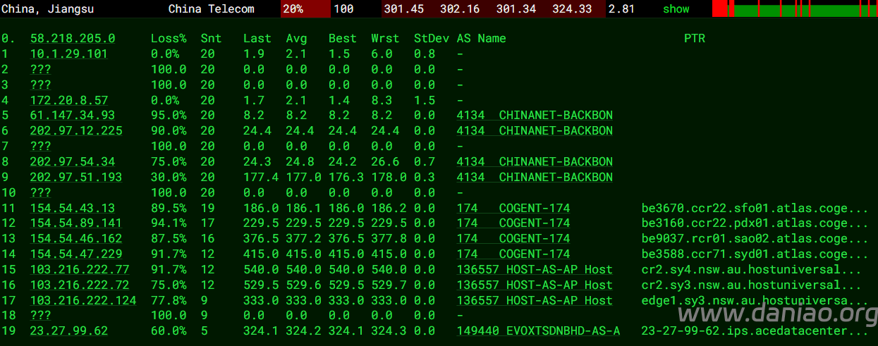 电信回程NTT/cogent,地理路径:澳大利亚 -> 新加坡 -> 国内,广东电信回程地理路径:澳大利亚 -> 美国 -> 国内