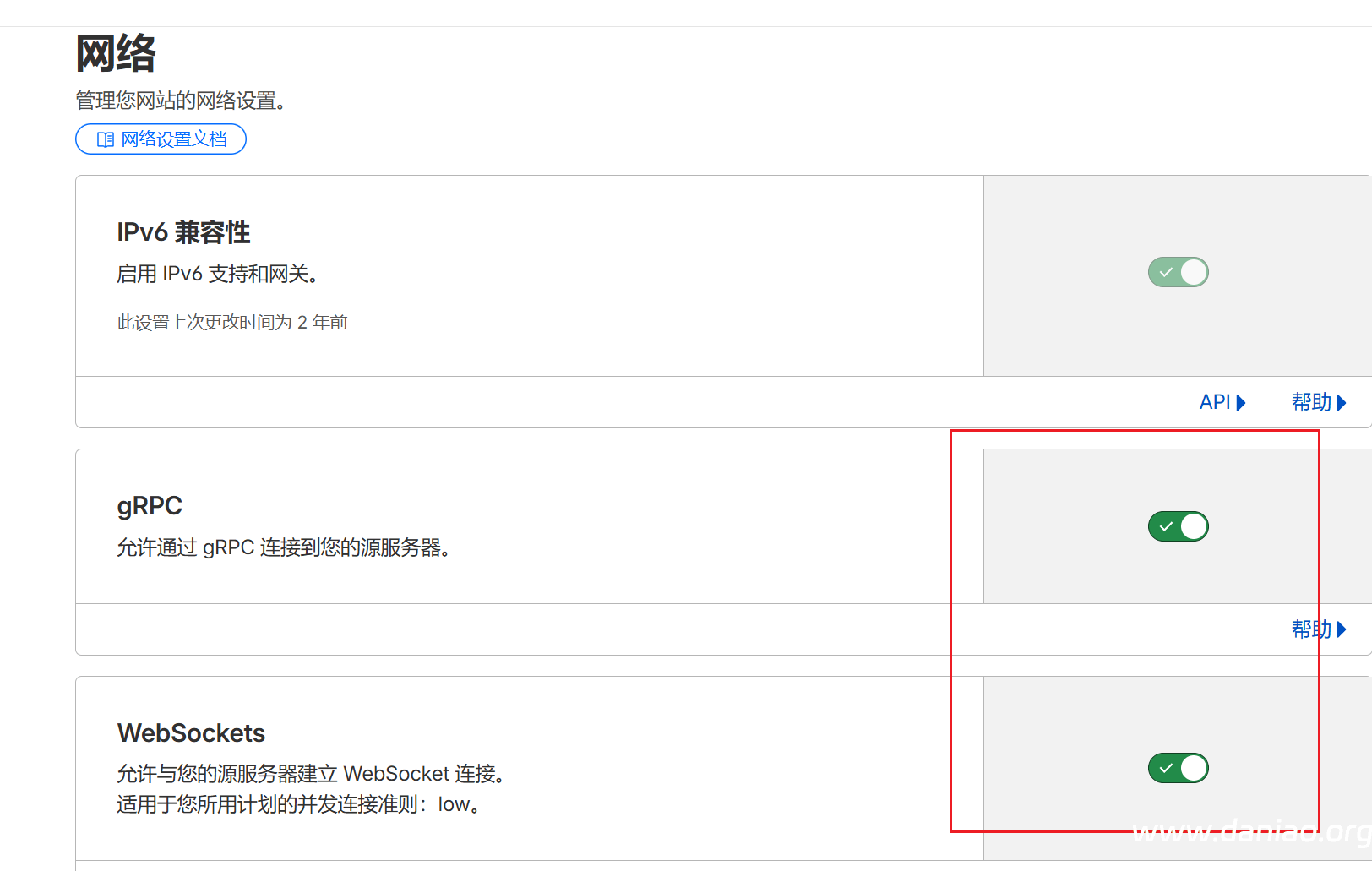 2)9f.ee域名设置页面——网络,选择开启WebSockets 和 gRPC ;