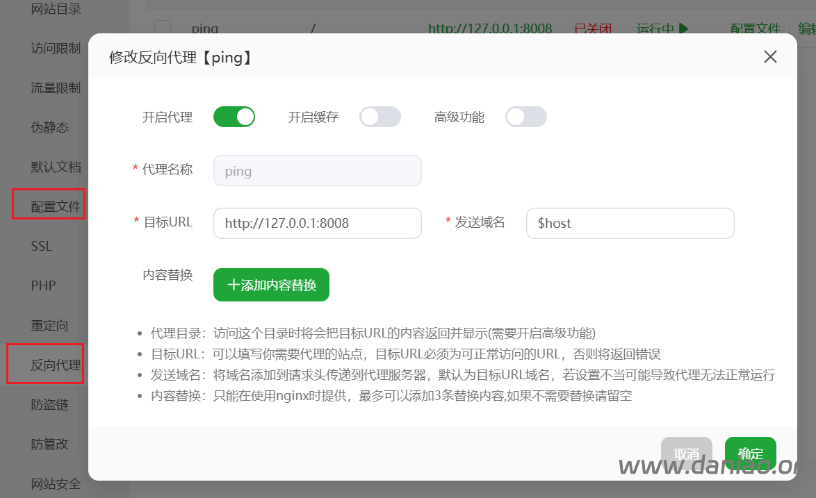 3)之后点击反向代理,宝塔的设置如下: