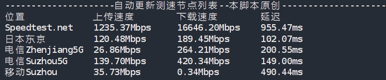 Node Name Upload Speed Download Speed Latency Speedtest.net 952.84 Mbps 25208.76 Mbps 0.72 ms Los Angeles, US 925.89 Mbps 22873.56 Mbps 0.80 ms Dallas, US 953.04 Mbps 8535.15 Mbps 29.09 ms Montreal, CA 657.07 Mbps 2302.78 Mbps 66.84 ms Paris, FR 586.27 Mbps 5670.54 Mbps 138.34 ms Amsterdam, NL 622.40 Mbps 5470.52 Mbps 134.08 ms Suzhou, CN 553.07 Mbps 5005.24 Mbps 149.57 ms Ningbo, CN 15.18 Mbps 1613.19 Mbps 159.79 ms Hong Kong, CN 2.70 Mbps 0.73 Mbps 147.28 ms Singapore, SG 457.18 Mbps 4367.35 Mbps 189.23 ms Taipei, CN 642.79 Mbps 6248.39 Mbps 128.15 ms Tokyo, JP 709.14 Mbps 6851.47 Mbps 121.43 ms ----------------------------------------------------------------------