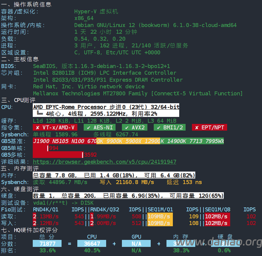 CPU Model : AMD EPYC-Rome Processor CPU Cores : 4 @ 2595.122 MHz CPU Cache : 512 KB AES-NI : ✓ Enabled VM-x/AMD-V : ✗ Disabled Total Disk : 19.6 GB (5.6 GB Used) Total RAM : 7.8 GB (1.4 GB Used) System Uptime : 1 days, 22 hour 2 min Load Average : 0.03, 0.03, 0.00 OS : Debian GNU/Linux 12 (bookworm) Arch : x86_64 (64 Bit) Kernel : 6.1.0-38-cloud-amd64 TCP Congestion Ctrl: bbr Virtualization : MICROSOFT IPv4/IPv6 : ✓ Online / ✗ Offline Organization : AS62610 Zenlayer Inc Location : Los Angeles / US Region : California ---------------------------------------------------------------------- I/O Speed(1st run) : 112 MB/s I/O Speed(2nd run) : 106 MB/s I/O Speed(3rd run) : 106 MB/s I/O Speed(average) : 108.0 MB/s