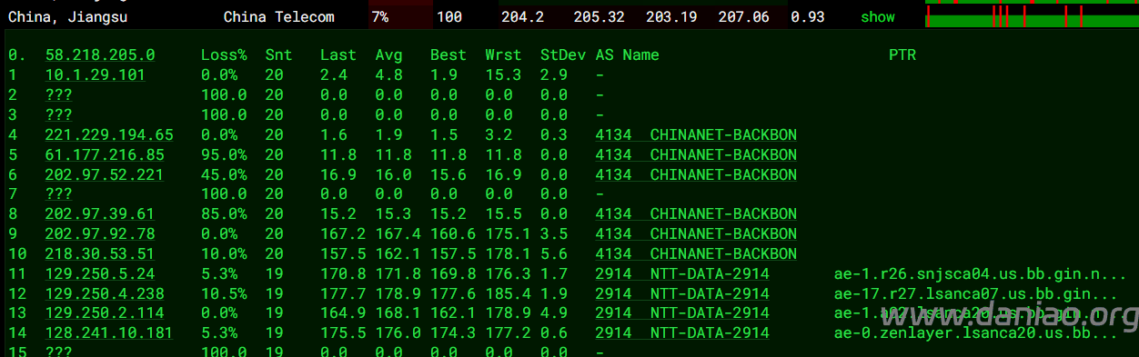 北京 电信 Arelion -> 163 地理路径:美国 -> 北京 自治系统路径:AS1299 -> AS4134 -> AS4847 2-5 0.75ms 10.5.*.* * RFC1918 6-9 0.96ms 62.115.*.* AS1299 [ARELION-NET] 美国 加利福尼亚 洛杉矶 arelion.com 10-12 165.70ms 202.97.*.* AS4134 [CHINANET-BB] 中国 北京 chinatelecom.com.cn 电信 14-15 172.20ms 36.112.*.* AS4847 中国 北京 bj.189.cn 16 172.99ms 219.141.*.* AS4847 [CHINATELECOM-BJ] 中国 北京 bj.189.cn 17 174.42ms 106.37.*.* AS4847 [CHINANET-HN] 中国 北京 bj.189.cn 上海 电信 Arelion -> 163 地理路径:美国 -> 北京 -> 上海 自治系统路径:AS1299 -> AS4134 -> AS4812 2-5 0.52ms 10.5.*.* * RFC1918 6-9 1.10ms 62.115.*.* AS1299 [ARELION-NET] 美国 加利福尼亚 洛杉矶 arelion.com 10 158.16ms 202.97.*.* AS4134 [CHINANET-BB] 中国 北京 北京 chinatelecom.com.cn 11-12 159.97ms 202.97.*.* AS4134 [CHINANET-BB] 中国 上海 I-C chinatelecom.com.cn 电信 19 174.96ms 101.226.*.* AS4812 [CHINANET-SH] 中国 上海市 chinatelecom.cn 电信 广东 电信 Arelion -> 163 地理路径:美国 -> 广东 自治系统路径:AS1299 -> AS4134 2-5 0.44ms 10.5.*.* * RFC1918 6-9 0.81ms 62.115.*.* AS1299 [ARELION-NET] 美国 加利福尼亚 洛杉矶 arelion.com 10 12.16ms 218.30.*.* AS4134 [CHINANET-US] 美国 加利福尼亚 圣何塞 Cogent/Telia-CT-PoP chinatelecom.com.cn 电信 11-13 165.62ms 202.97.*.* AS4134 [CHINANET-BB] 中国 广东 广州 chinatelecom.com.cn 电信 14 169.25ms 113.96.*.* AS4134 [CHINANET-GD] 中国 广东 广州 chinatelecom.com.cn 电信 20 173.19ms 183.47.*.* AS4134 [APNIC-AP] 中国 广东省 广州市 chinatelecom.com.cn 电信