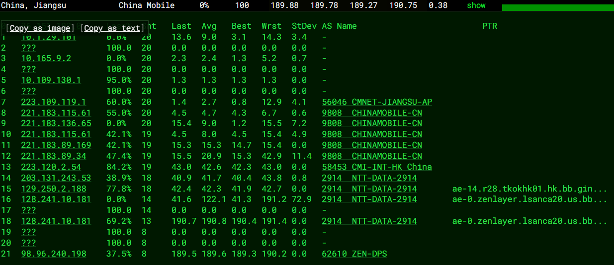 北京 移动 Arelion -> CMI 地理路径:美国 -> 北京 自治系统路径:AS1299 -> AS58453 -> AS9808 -> AS56048 2-5 0.62ms 10.5.*.* * RFC1918 6-9 1.03ms 62.115.*.* AS1299 [ARELION-NET] 美国 加利福尼亚 洛杉矶 arelion.com 10-11 1.74ms 223.120.*.* AS58453 [CMI-INT] 美国 加利福尼亚 洛杉矶 cmi.chinamobile.com 移动 12-15 177.10ms 221.183.*.* AS9808 [CMNET] 中国 北京 X-I chinamobileltd.com 移动 16-19 212.26ms 211.136.*.* AS56048 [CMNET] 中国 北京 bj.10086.cn 移动 21 192.72ms 211.136.*.* AS56048 [CMNET] 中国 北京 bj.10086.cn 移动 上海 移动 Arelion -> CMI 地理路径:美国 -> 上海 自治系统路径:AS1299 -> AS58453 -> AS9808 2-5 0.51ms 10.5.*.* * RFC1918 6-8 1.00ms 62.115.*.* AS1299 [ARELION-NET] 美国 加利福尼亚 洛杉矶 arelion.com 9-10 29.22ms 62.115.*.* AS1299 [ARELION-NET] 美国 华盛顿 西雅图 arelion.com 11-12 28.42ms 223.120.*.* AS58453 [CMI-INT] 美国 华盛顿州 西雅图 cmi.chinamobile.com 移动 13-16 187.36ms 221.183.*.* AS9808 [CMNET] 中国 上海 X-I chinamobileltd.com 移动 19 191.59ms 117.185.*.* AS9808 [CMNET] 中国 上海市 chinamobileltd.com 移动 广东 移动 NTT -> CMI 地理路径:美国 -> 香港 -> 广东 自治系统路径:AS2914 -> AS58453 -> AS9808 -> AS56040 2-5 0.30ms 10.5.*.* * RFC1918 6 0.63ms 128.241.*.* AS2914 [NTTA-128] 美国 加利福尼亚 洛杉矶 gin.ntt.net 7 0.88ms 129.250.*.* AS2914 [NTT-BACKBONE] 美国 加利福尼亚 洛杉矶 gin.ntt.net 10-11 150.71ms 129.250.*.* AS2914 [NTT-BACKBONE] 中国 香港 gin.ntt.net 14 153.23ms 223.120.*.* AS58453 [CMI-INT] 中国 广东 广州 cmi.chinamobile.com 移动 15-18 179.14ms 221.183.*.* AS9808 [CMNET] 中国 广东 广州 X-I chinamobileltd.com 移动 19-20 189.94ms 211.136.*.* AS56040 [CMNET] 中国 广东 广州 gd.10086.cn 移动 21-22 192.13ms 120.198.*.* AS56040 [APNIC-AP] 中国 广东 广州 gd.10086.cn 移动 25 199.86ms 211.139.*.* AS56040 [CMNET] 中国 广东 广州 gd.10086.cn 移动