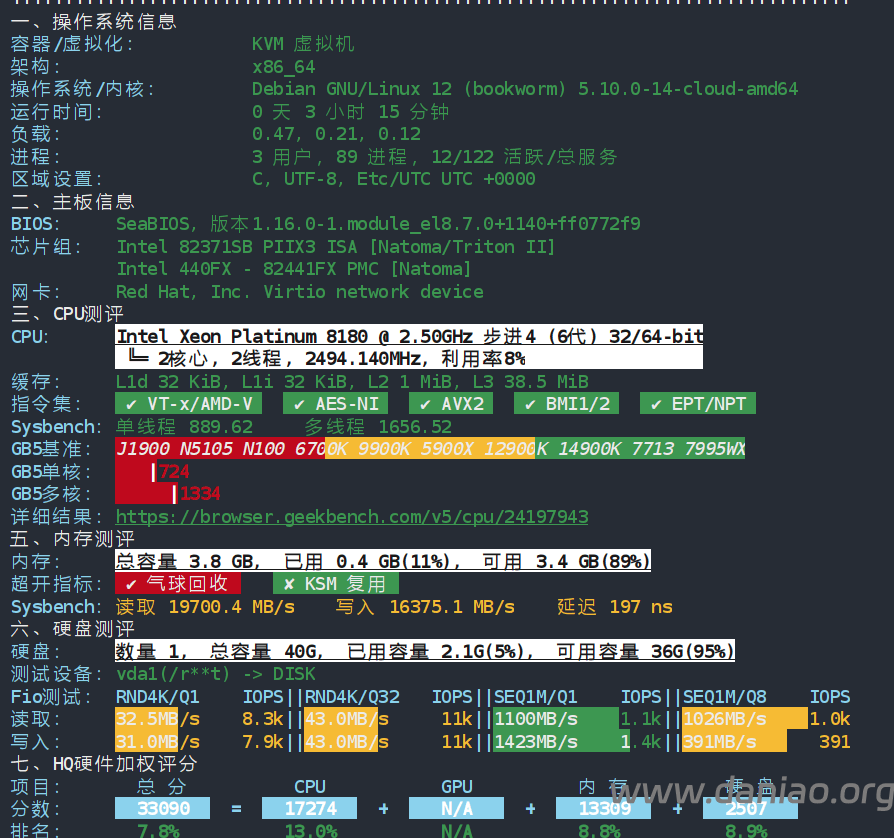 CPU Model : Intel(R) Xeon(R) Platinum 8180 CPU @ 2.50GHz CPU Cores : 2 @ 2494.140 MHz CPU Cache : 39424 KB AES-NI : ✓ Enabled VM-x/AMD-V : ✓ Enabled Total Disk : 39.3 GB (749.4 MB Used) Total RAM : 3.8 GB (120.9 MB Used) System Uptime : 0 days, 3 hour 5 min Load Average : 0.18, 0.08, 0.03 OS : Debian GNU/Linux 11 (bullseye) Arch : x86_64 (64 Bit) Kernel : 5.10.0-14-cloud-amd64 TCP Congestion Ctrl: bbr Virtualization : KVM IPv4/IPv6 : ✓ Online / ✗ Offline Organization : AS42960 VH Global Limited Location : Singapore / SG Region : Singapore ---------------------------------------------------------------------- I/O Speed(1st run) : 402 MB/s I/O Speed(2nd run) : 454 MB/s I/O Speed(3rd run) : 419 MB/s I/O Speed(average) : 425.0 MB/s