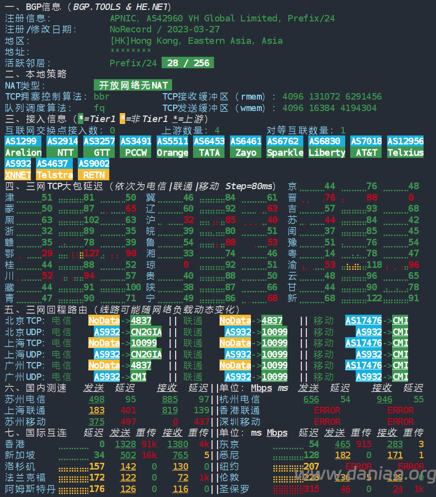 北京 电信 Unknown -> 4837 地理路径:香港 -> 广东 -> 北京 自治系统路径:AS10099 -> AS4837 -> AS4847 1-2 0.34ms 10.0.*.* * RFC1918 4-6 2.88ms 103.214.*.* AS10099 中国 香港 chinaunicomglobal.com 联通 8 79.09ms 219.158.*.* AS4837 [CU169-BACKBONE] 中国 广东 广州 X-I chinaunicom.cn 联通 15 43.88ms 36.112.*.* AS4847 中国 北京 bj.189.cn 16-17 47.37ms 219.141.*.* AS4847 [CHINATELECOM-BJ] 中国 北京 bj.189.cn 18 45.17ms 106.37.*.* AS4847 [CHINANET-HN] 中国 北京 bj.189.cn 上海 电信 Unknown -> 4837 地理路径:香港 -> 广东 -> 上海 自治系统路径:AS10099 -> AS4837 -> AS4812 1-2 0.27ms 10.0.*.* * RFC1918 4-6 2.68ms 103.214.*.* AS10099 中国 香港 chinaunicomglobal.com 联通 8 78.98ms 219.158.*.* AS4837 [CU169-BACKBONE] 中国 广东 广州 X-I chinaunicom.cn 联通 20 33.96ms 101.226.*.* AS4812 [CHINANET-SH] 中国 上海市 chinatelecom.cn 电信 广东 电信 Unknown -> 10099 地理路径:香港 -> 广东 自治系统路径:AS10099 -> AS4837 -> AS4134 1-2 0.20ms 10.0.*.* * RFC1918 4-6 2.79ms 103.214.*.* AS10099 中国 香港 chinaunicomglobal.com 联通 7-9 74.85ms 219.158.*.* AS4837 [CU169-BACKBONE] 中国 广东 广州 chinaunicom.cn 12 10.16ms 202.97.*.* AS4134 [CHINANET-BB] 中国 广东 广州 chinatelecom.com.cn 电信 15 10.77ms 113.108.*.* AS4134 [CHINANET-GD] 中国 广东省 广州市 chinatelecom.com.cn 电信 19 11.96ms 183.47.*.* AS4134 [APNIC-AP] 中国 广东省 广州市 chinatelecom.com.cn 电信