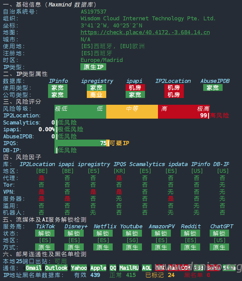 IP为西班牙原生IP,具有双ISP属性,具体的可以参考上面的测评数据~