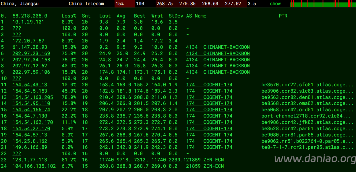 北京 电信 Cogent -> 163 地理路径:法国 -> 德国 -> 北京 自治系统路径:AS21859 -> AS174 -> AS4134 -> AS4847 2 0.20ms 128.1.*.* AS21859 法国 法兰西岛大区 巴黎 zenlayer.com 3 0.26ms 172.22.*.* * RFC1918 5-6 3.00ms 154.25.*.* AS174 [COGENT-BONE] 法国 法兰西岛大区 巴黎 cogentco.com 7-8 10.60ms 154.54.*.* AS174 [COGENT-BONE] 德国 黑森 美因河畔法兰克福 cogentco.com 9 11.20ms 149.11.*.* AS174 [COGENT-149] 德国 黑森 美因河畔法兰克福 cogentco.com 10-12 225.61ms 202.97.*.* AS4134 [CHINANET-BB] 中国 北京 X-I chinatelecom.com.cn 电信 14 234.38ms 219.141.*.* AS4847 [CHINATELECOM-BJ] 中国 北京 bj.189.cn 15 226.73ms 36.112.*.* AS4847 中国 北京 bj.189.cn 17 237.11ms 106.37.*.* AS4847 [CHINANET-HN] 中国 北京 bj.189.cn 上海 电信 Cogent -> 163 地理路径:法国 -> 德国 -> 上海 自治系统路径:AS21859 -> AS174 -> AS4134 -> AS4812 2 0.22ms 128.1.*.* AS21859 法国 法兰西岛大区 巴黎 zenlayer.com 3 0.25ms 172.22.*.* * RFC1918 5-6 3.55ms 154.25.*.* AS174 [COGENT-BONE] 法国 法兰西岛大区 巴黎 cogentco.com 7-8 10.69ms 154.54.*.* AS174 [COGENT-BONE] 德国 黑森 美因河畔法兰克福 cogentco.com 9 11.75ms 149.11.*.* AS174 [COGENT-149] 德国 黑森 美因河畔法兰克福 cogentco.com 10-12 210.01ms 202.97.*.* AS4134 [CHINANET-BB] 中国 上海 chinatelecom.com.cn 电信 13 233.08ms 101.95.*.* AS4812 [CHINANET-SH] 中国 上海 chinatelecom.cn 电信 19 234.68ms 101.226.*.* AS4812 [CHINANET-SH] 中国 上海市 chinatelecom.cn 电信 广东 电信 Cogent -> 163 地理路径:法国 -> 德国 -> 广东 自治系统路径:AS21859 -> AS174 -> AS4134 2 0.20ms 128.1.*.* AS21859 法国 法兰西岛大区 巴黎 zenlayer.com 3 0.27ms 172.22.*.* * RFC1918 5-6 3.33ms 154.25.*.* AS174 [COGENT-BONE] 法国 法兰西岛大区 巴黎 cogentco.com 7-8 10.49ms 154.54.*.* AS174 [COGENT-BONE] 德国 黑森 美因河畔法兰克福 cogentco.com 9 10.99ms 149.11.*.* AS174 [COGENT-149] 德国 黑森 美因河畔法兰克福 cogentco.com 10-12 231.29ms 202.97.*.* AS4134 [CHINANET-BB] 中国 广东 广州 chinatelecom.com.cn 15 246.04ms 113.108.*.* AS4134 [CHINANET-GD] 中国 广东省 广州市 chinatelecom.com.cn 电信 19 245.40ms 183.47.*.* AS4134 [APNIC-AP] 中国 广东省 广州市 chinatelecom.com.cn 电信