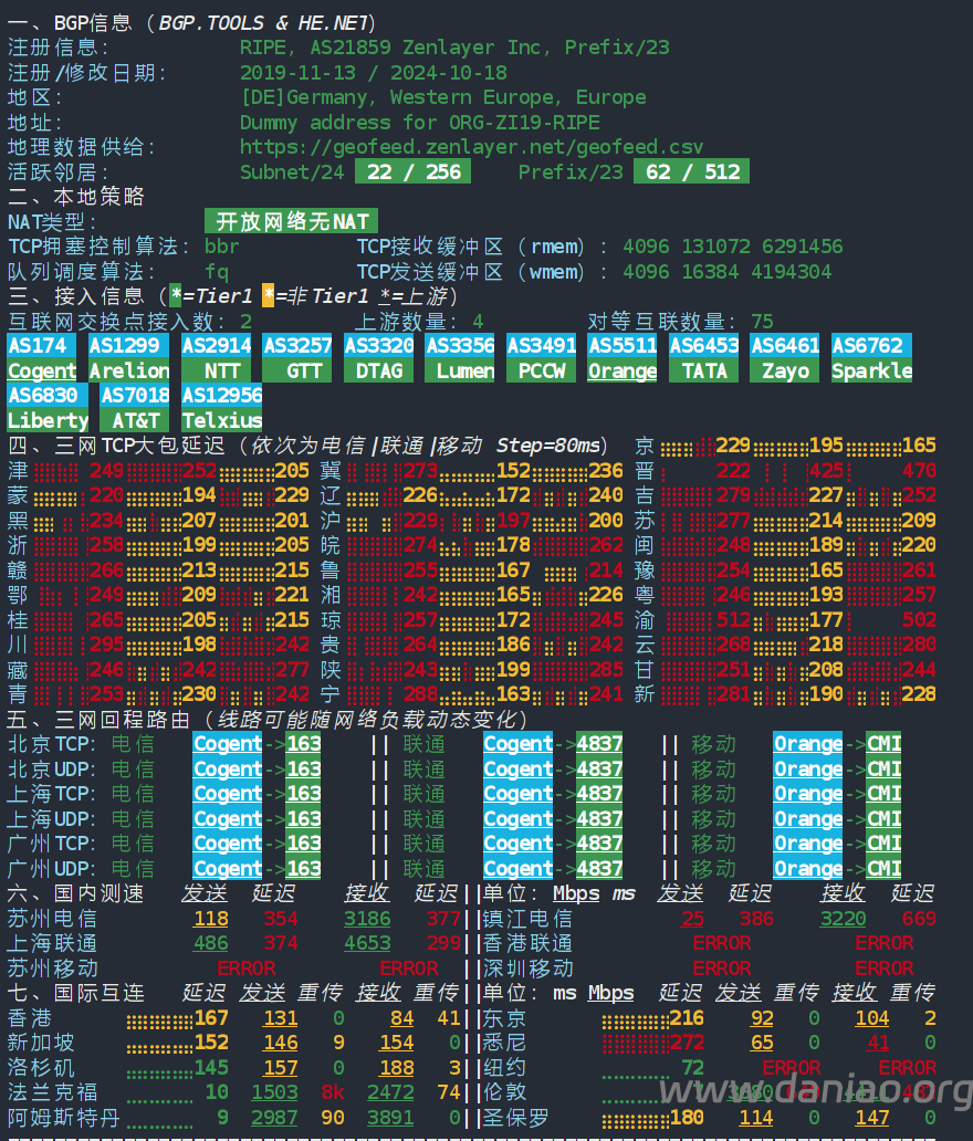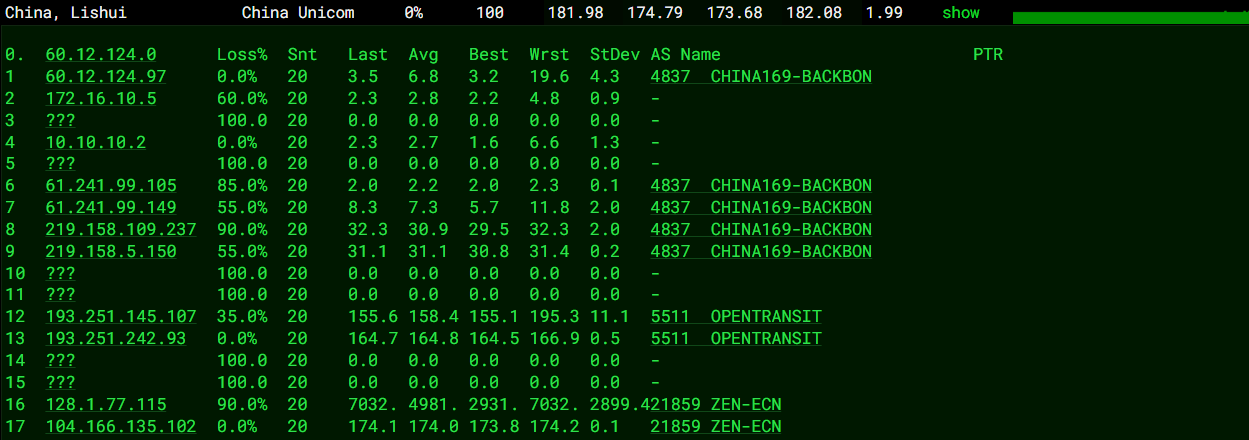 北京 联通 Cogent -> 4837 地理路径:法国 -> 德国 -> 美国 -> 北京 自治系统路径:AS21859 -> AS174 -> AS4837 -> AS4808 2 0.19ms 128.1.*.* AS21859 法国 法兰西岛大区 巴黎 zenlayer.com 3 0.25ms 172.22.*.* * RFC1918 5-6 2.77ms 154.25.*.* AS174 [COGENT-BONE] 法国 法兰西岛大区 巴黎 cogentco.com 7-8 10.72ms 154.54.*.* AS174 [COGENT-BONE] 德国 黑森 美因河畔法兰克福 cogentco.com 9 9.82ms 149.11.*.* AS174 [COGENT-149] 德国 黑森州 美因河畔法兰克福 cogentco.com 10 247.88ms 219.158.*.* AS4837 [CU169-BACKBONE] 美国 加利福尼亚 洛杉矶 chinaunicom.cn 11 130.58ms 219.158.*.* AS4837 [CU169-BACKBONE] 中国 北京 chinaunicom.cn 13-14 153.83ms 125.33.*.* AS4808 [UNICOM-BJ] 中国 北京 www.bbn.com.cn 联通 18 187.96ms 221.222.*.* AS4808 [UNICOM-BJ] 中国 北京 海淀 www.bbn.com.cn 上海 联通 Cogent -> 4837 地理路径:法国 -> 德国 -> 广东 -> 上海 自治系统路径:AS21859 -> AS174 -> AS4837 -> AS140979 2 0.30ms 128.1.*.* AS21859 法国 法兰西岛大区 巴黎 zenlayer.com 3 0.24ms 172.22.*.* * RFC1918 5-6 1.65ms 154.25.*.* AS174 [COGENT-BONE] 法国 法兰西岛大区 巴黎 cogentco.com 7-8 10.61ms 154.54.*.* AS174 [COGENT-BONE] 德国 黑森 美因河畔法兰克福 cogentco.com 9 22.57ms 149.11.*.* AS174 [COGENT-149] 德国 黑森州 美因河畔法兰克福 cogentco.com 10-11 168.39ms 219.158.*.* AS4837 [CU169-BACKBONE] 中国 广东 广州 chinaunicom.cn 联通 20 164.21ms 112.64.*.* AS140979 [APNIC-AP] 中国 上海市 闵行 chinaunicom.cn 联通 广东 联通 Cogent -> 4837 地理路径:法国 -> 德国 -> 北京 -> 广东 自治系统路径:AS21859 -> AS174 -> AS4837 -> AS136958 2 0.22ms 128.1.*.* AS21859 法国 法兰西岛大区 巴黎 zenlayer.com 3 0.27ms 172.22.*.* * RFC1918 5-6 3.03ms 154.25.*.* AS174 [COGENT-BONE] 法国 法兰西岛大区 巴黎 cogentco.com 7-8 10.45ms 154.54.*.* AS174 [COGENT-BONE] 德国 黑森 美因河畔法兰克福 cogentco.com 9 22.52ms 149.11.*.* AS174 [COGENT-149] 德国 黑森州 美因河畔法兰克福 cogentco.com 10 213.99ms 219.158.*.* AS4837 [CU169-BACKBONE] 中国 北京市 chinaunicom.cn 联通 11 169.50ms 219.158.*.* AS4837 [CU169-BACKBONE] 中国 广东 广州 X-I chinaunicom.cn 联通 19 194.86ms 157.148.*.* AS136958 [UNICOM-GD] 中国 广东省 广州市 chinaunicom.cn 联通
