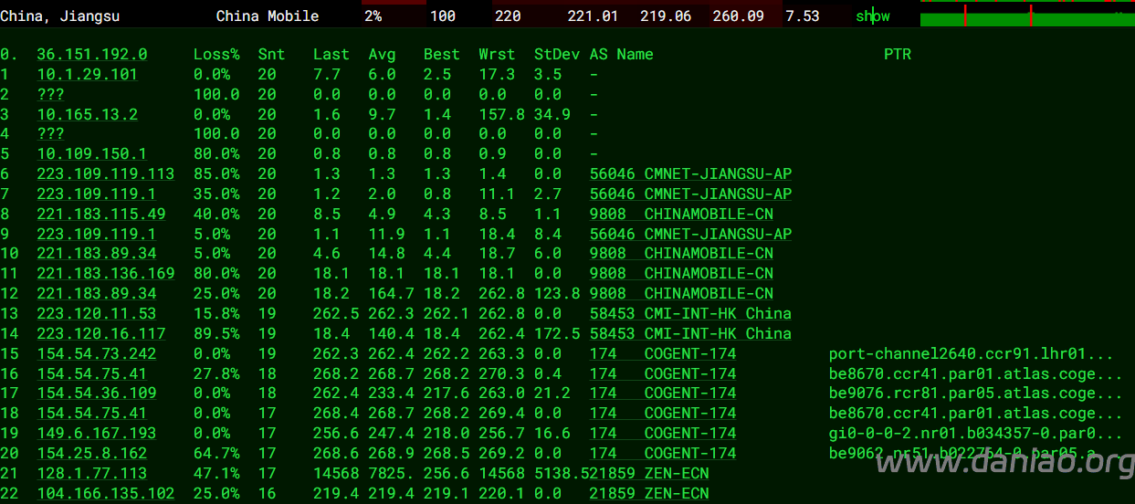 北京 移动 Orange -> CMI 地理路径:法国 -> 香港 -> 北京 自治系统路径:AS21859 -> AS5511 -> AS58453 -> AS9808 -> AS56048 2 0.20ms 128.1.*.* AS21859 法国 法兰西岛大区 巴黎 zenlayer.com 3 0.27ms 172.22.*.* * RFC1918 4 0.62ms 193.251.*.* AS5511 [OPENTRANSIT-BACKBONE]法国 法兰西岛大区 巴黎 wholesale.orange.com 5 8.73ms 193.251.*.* AS5511 [OPENTRANSIT-BACKBONE]法国 wholesale.orange.com 6 8.41ms 81.52.*.* * 法国 法兰西岛大区 巴黎 7 15.29ms 223.118.*.* AS58453 [CMI-INT] 中国 香港 cmi.chinamobile.com 8-11 162.31ms 221.183.*.* AS9808 [CMNET] 中国 北京 X-I chinamobileltd.com 移动 12-15 211.79ms 211.136.*.* AS56048 [CMNET] 中国 北京 bj.10086.cn 移动 17 193.61ms 211.136.*.* AS56048 [CMNET] 中国 北京 bj.10086.cn 移动 上海 移动 Orange -> CMI 地理路径:法国 -> 香港 -> 上海 自治系统路径:AS21859 -> AS5511 -> AS58453 -> AS9808 2 0.23ms 128.1.*.* AS21859 法国 法兰西岛大区 巴黎 zenlayer.com 3 0.27ms 172.22.*.* * RFC1918 4 0.71ms 193.251.*.* AS5511 [OPENTRANSIT-BACKBONE]法国 法兰西岛大区 巴黎 wholesale.orange.com 5 8.71ms 193.251.*.* AS5511 [OPENTRANSIT-BACKBONE]法国 wholesale.orange.com 6 8.38ms 81.52.*.* * 法国 法兰西岛大区 巴黎 7 14.66ms 223.118.*.* AS58453 [CMI-INT] 中国 香港 cmi.chinamobile.com 8-10 238.01ms 221.183.*.* AS9808 [CMNET] 中国 上海 X-I chinamobileltd.com 移动 13 204.60ms 117.185.*.* AS9808 [CMNET] 中国 上海市 chinamobileltd.com 移动 广东 移动 Orange -> CMI 地理路径:法国 -> 德国 -> 广东 自治系统路径:AS21859 -> AS5511 -> AS58453 -> AS9808 -> AS56040 2 0.22ms 128.1.*.* AS21859 法国 法兰西岛大区 巴黎 zenlayer.com 3 0.21ms 172.22.*.* * RFC1918 4 0.82ms 193.251.*.* AS5511 [OPENTRANSIT-BACKBONE]法国 法兰西岛大区 巴黎 wholesale.orange.com 5 96.39ms 193.251.*.* AS5511 [OPENTRANSIT-BACKBONE]法国 wholesale.orange.com 6 8.43ms 81.52.*.* * 法国 法兰西岛大区 巴黎 7 15.50ms 223.120.*.* AS58453 [CMI-INT] 德国 黑森 美茵河畔法兰克福 cmi.chinamobile.com 移动 8-11 244.32ms 221.183.*.* AS9808 [CMNET] 中国 广东 广州 X-I chinamobileltd.com 移动 12-15 251.22ms 183.235.*.* AS56040 [APNIC-AP] 中国 广东 广州 gd.10086.cn 移动 18 263.98ms 211.139.*.* AS56040 [CMNET] 中国 广东 广州 gd.10086.cn 移动