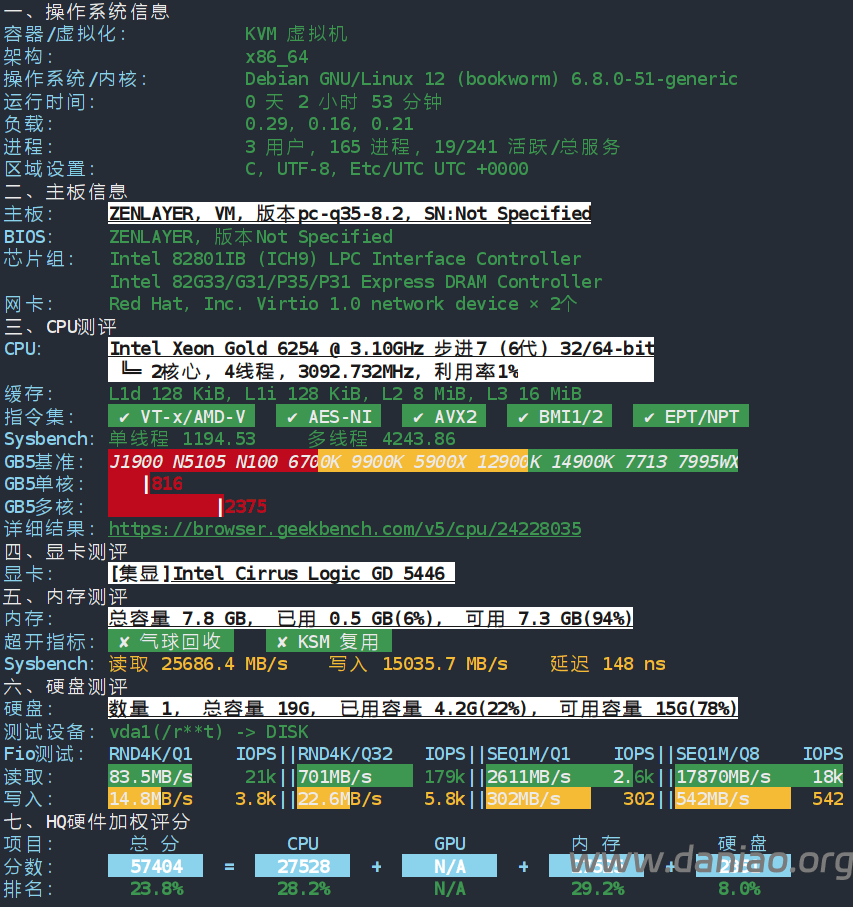 CPU是Xeon(R) Gold 6254 CPU @ 3.10GHz ,AMD EPYC Rome 发布于 2019 年,采用 Zen 2 架构。磁盘IO:105.0 MB/s(当前测试)