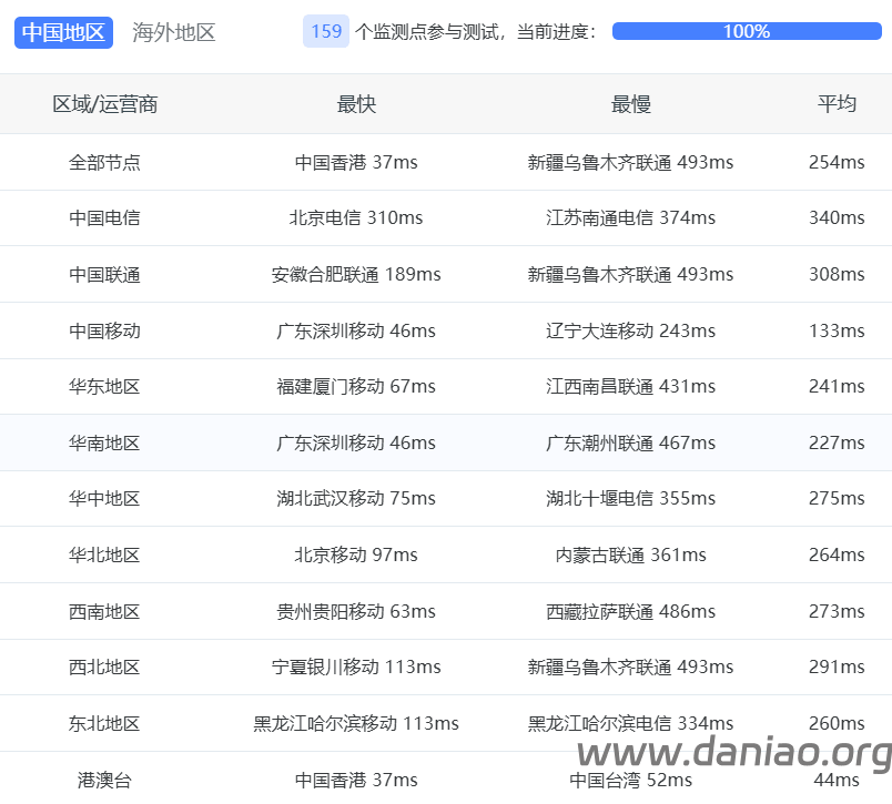 | 电信 (163) | 延迟中等,需绕道英国 |