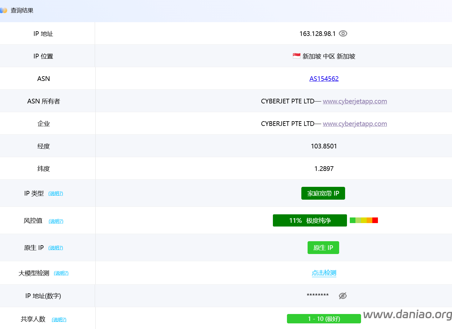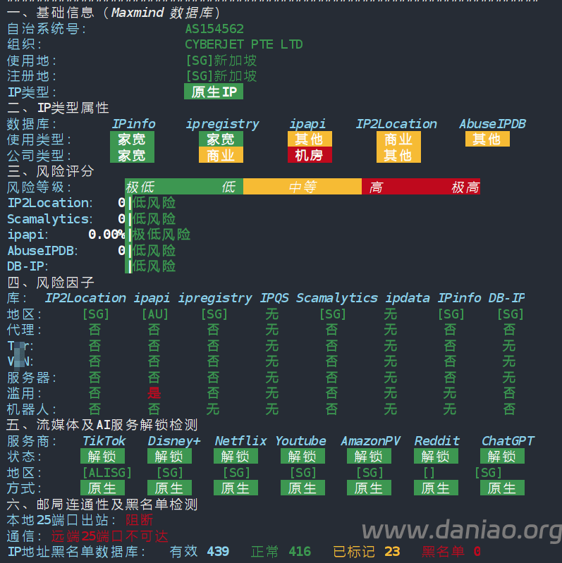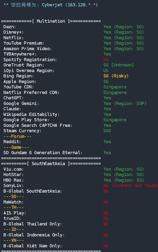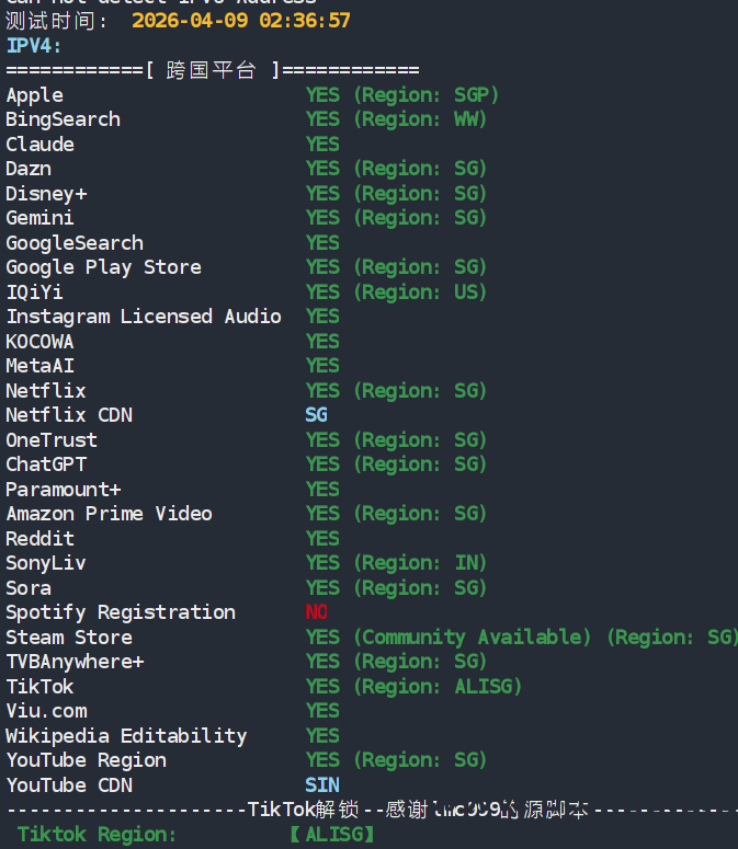 IP为新加坡原生IP,具体双ISP属性,解锁能力优秀,解锁TikTok/AI,适合流媒体/游戏/电商等