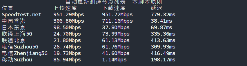 Node Name Upload Speed Download Speed Latency Speedtest.net 952.59 Mbps 954.46 Mbps 0.40 ms Los Angeles, US 479.31 Mbps 984.11 Mbps 167.73 ms Dallas, US 387.28 Mbps 927.21 Mbps 205.14 ms Montreal, CA 357.09 Mbps 466.01 Mbps 225.94 ms Paris, FR 517.80 Mbps 987.33 Mbps 160.40 ms Amsterdam, NL 496.28 Mbps 817.07 Mbps 159.26 ms Suzhou, CN 258.17 Mbps 596.17 Mbps 319.60 ms Ningbo, CN 57.05 Mbps 412.99 Mbps 364.39 ms Hong Kong, CN 930.48 Mbps 953.00 Mbps 41.93 ms Singapore, SG 951.96 Mbps 859.80 Mbps 1.49 ms Taipei, CN 937.22 Mbps 976.20 Mbps 43.53 ms Tokyo, JP 878.01 Mbps 978.76 Mbps 67.08 ms ----------------------------------------------------------------------