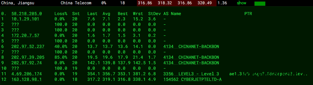| 电信 | Level3→163 | 新加坡 → 英国 → 北京 | ~316ms | AS4134/AS4847 |