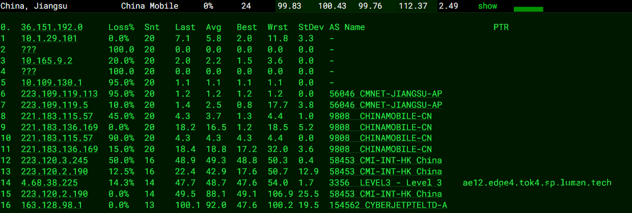 | 移动 | Level3→CMI | 新加坡 → 中国香港 → 广东 | ~187ms | AS58453/AS9808/AS56040 |
