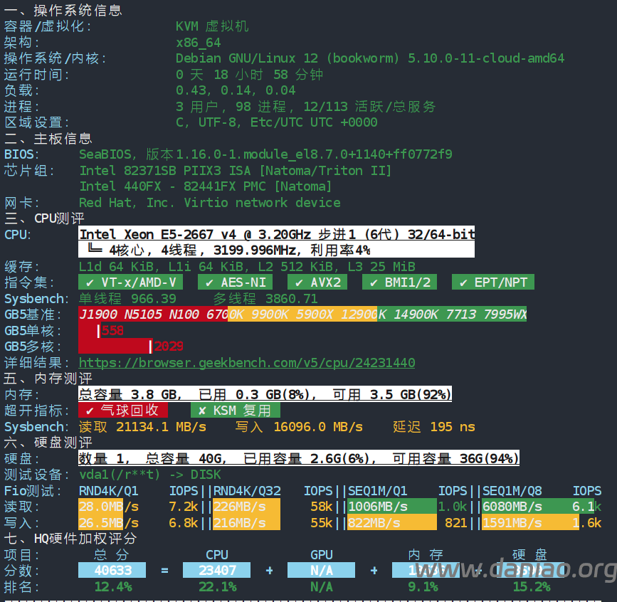 CPU Model : Intel(R) Xeon(R) CPU E5-2667 v4 @ 3.20GHz CPU Cores : 4 @ 3199.996 MHz CPU Cache : 25600 KB AES-NI : ✓ Enabled VM-x/AMD-V : ✓ Enabled Total Disk : 39.3 GB (1.2 GB Used) Total RAM : 3.8 GB (72.4 MB Used) System Uptime : 0 days, 18 hour 38 min Load Average : 0.00, 0.00, 0.00 OS : Debian GNU/Linux 11 (bullseye) Arch : x86_64 (64 Bit) Kernel : 5.10.0-11-cloud-amd64 TCP Congestion Ctrl: bbr Virtualization : KVM IPv4/IPv6 : ✓ Online / ✗ Offline Organization : AS154562 CYBERJET PTE LTD Location : Singapore / SG Region : Singapore ---------------------------------------------------------------------- I/O Speed(1st run) : 274 MB/s I/O Speed(2nd run) : 275 MB/s I/O Speed(3rd run) : 268 MB/s I/O Speed(average) : 272.3 MB/s