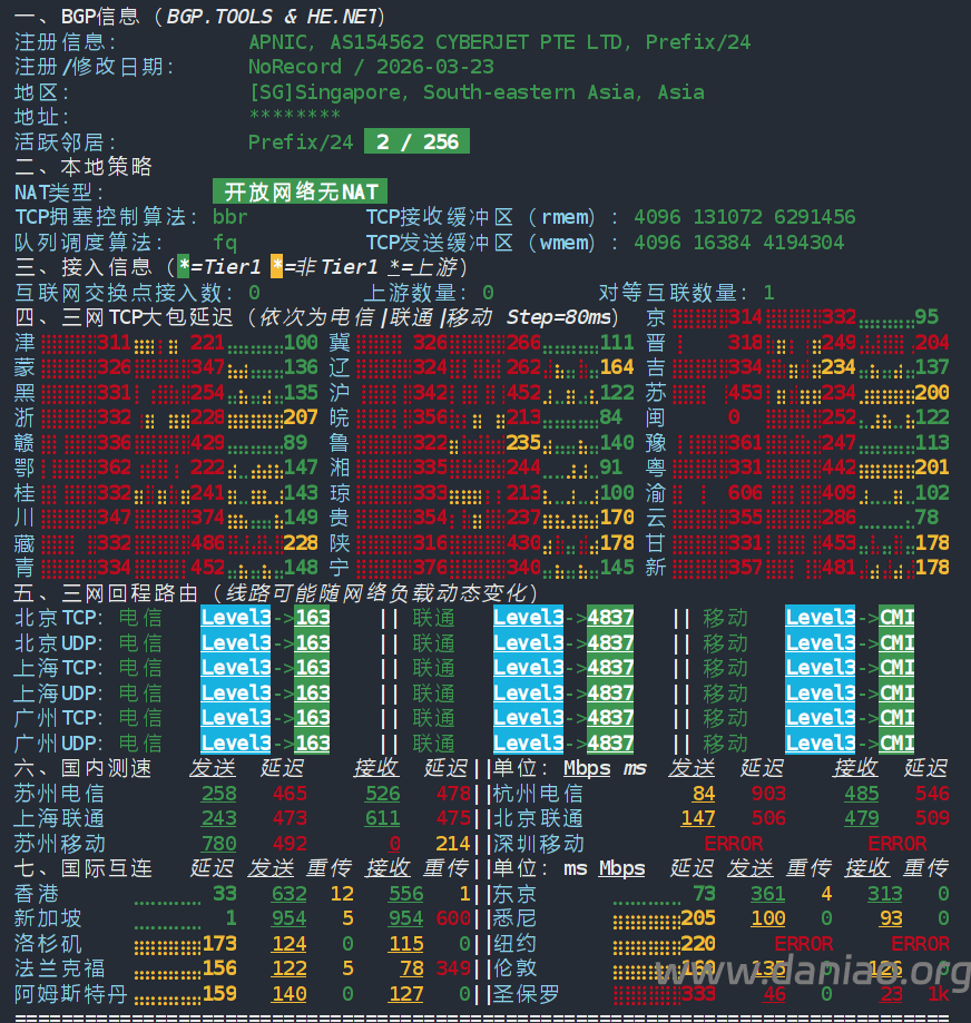 北京 电信 Level3 -> 163 地理路径:新加坡 -> 英国 -> 北京 自治系统路径:AS154562 -> AS3356 -> AS4134 -> AS4847 1 8.31ms 163.128.*.* AS154562 新加坡 CYBERJET PTE LTD 2 1.41ms 8.245.*.* AS3356 新加坡 lumen.com 4 244.64ms 212.133.*.* AS3356 英国 lumen.com 5-7 310.96ms 202.97.*.* AS4134 [CHINANET-BB] 中国 北京 chinatelecom.com.cn 电信 9-10 314.14ms 36.112.*.* AS4847 中国 北京 bj.189.cn 11 316.18ms 219.141.*.* AS4847 [CHINATELECOM-BJ] 中国 北京 bj.189.cn 12 314.99ms 106.37.*.* AS4847 [CHINANET-HN] 中国 北京 bj.189.cn 上海 电信 Level3 -> 163 地理路径:新加坡 -> 英国 -> 上海 自治系统路径:AS154562 -> AS3356 -> AS4134 -> AS4812 1 0.80ms 163.128.*.* AS154562 新加坡 CYBERJET PTE LTD 2 15.10ms 8.245.*.* AS3356 新加坡 lumen.com 4 243.66ms 212.133.*.* AS3356 英国 lumen.com 5-7 324.59ms 202.97.*.* AS4134 [CHINANET-BB] 中国 上海 chinatelecom.com.cn 电信 8 357.86ms 101.95.*.* AS4812 [CHINANET-SH] 中国 上海 chinatelecom.cn 电信 14 338.16ms 101.226.*.* AS4812 [CHINANET-SH] 中国 上海市 chinatelecom.cn 电信 广东 电信 Level3 -> 163 地理路径:新加坡 -> 英国 -> 广东 自治系统路径:AS154562 -> AS3356 -> AS4134 1 1.07ms 163.128.*.* AS154562 新加坡 CYBERJET PTE LTD 2 14.42ms 8.245.*.* AS3356 新加坡 lumen.com 4 242.09ms 212.133.*.* AS3356 英国 lumen.com 5-6 326.06ms 202.97.*.* AS4134 [CHINANET-BB] 中国 广东 广州 chinatelecom.com.cn 8 326.93ms 113.96.*.* AS4134 [CHINANET-GD] 中国 广东 广州 chinatelecom.com.cn 电信 10 324.91ms 14.18.*.* AS4134 中国 广东 广州 chinatelecom.com.cn 电信 14 332.65ms 183.47.*.* AS4134 [APNIC-AP] 中国 广东省 广州市 chinatelecom.com.cn 电信