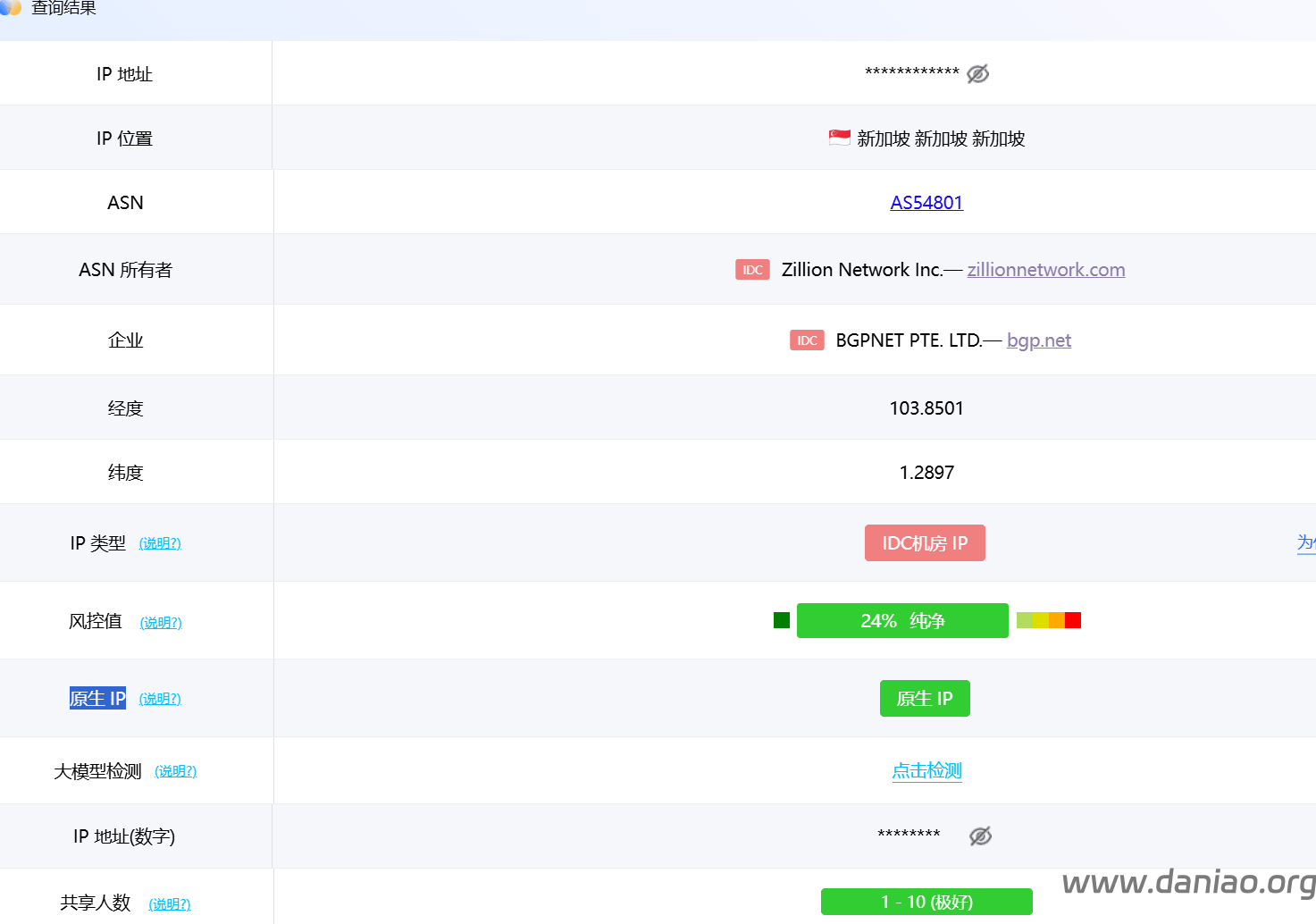 IP质量测试:原生IP,某些数据库显示为双ISP~
