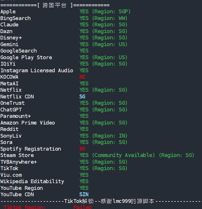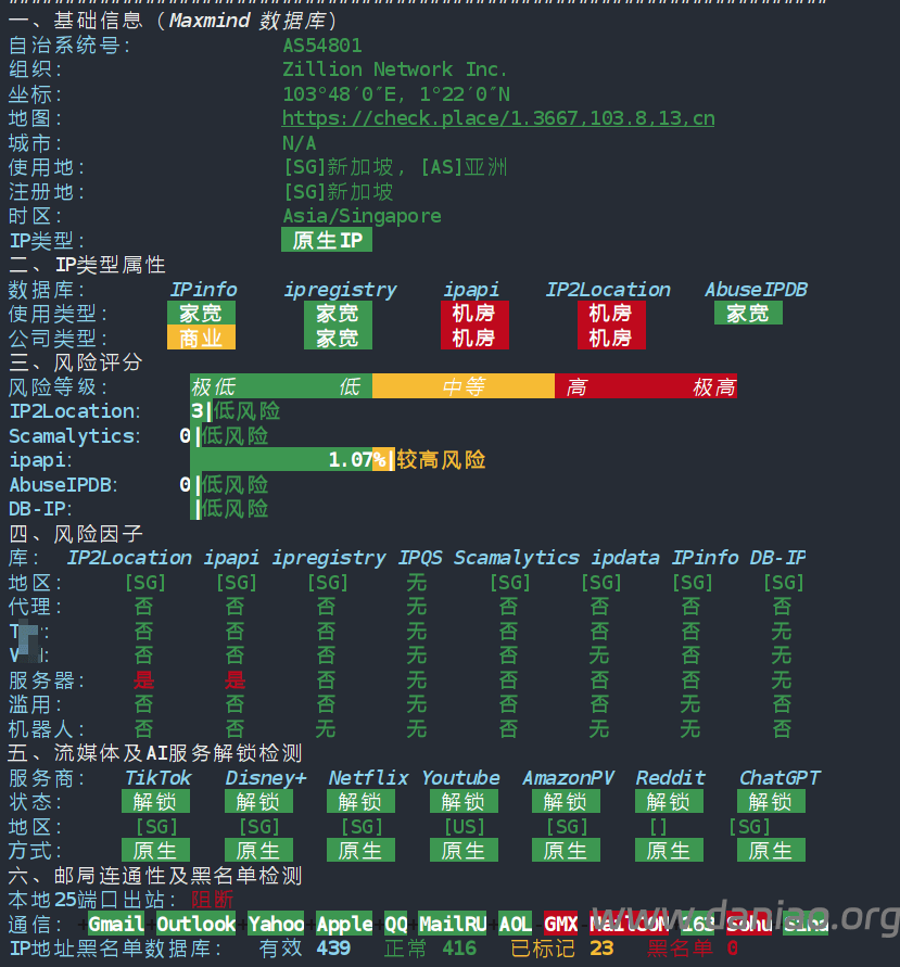 IP为新加坡原生,某些数据库显示有ISP属性,解锁能力优秀,流媒体和一些AI应用都可以解锁。