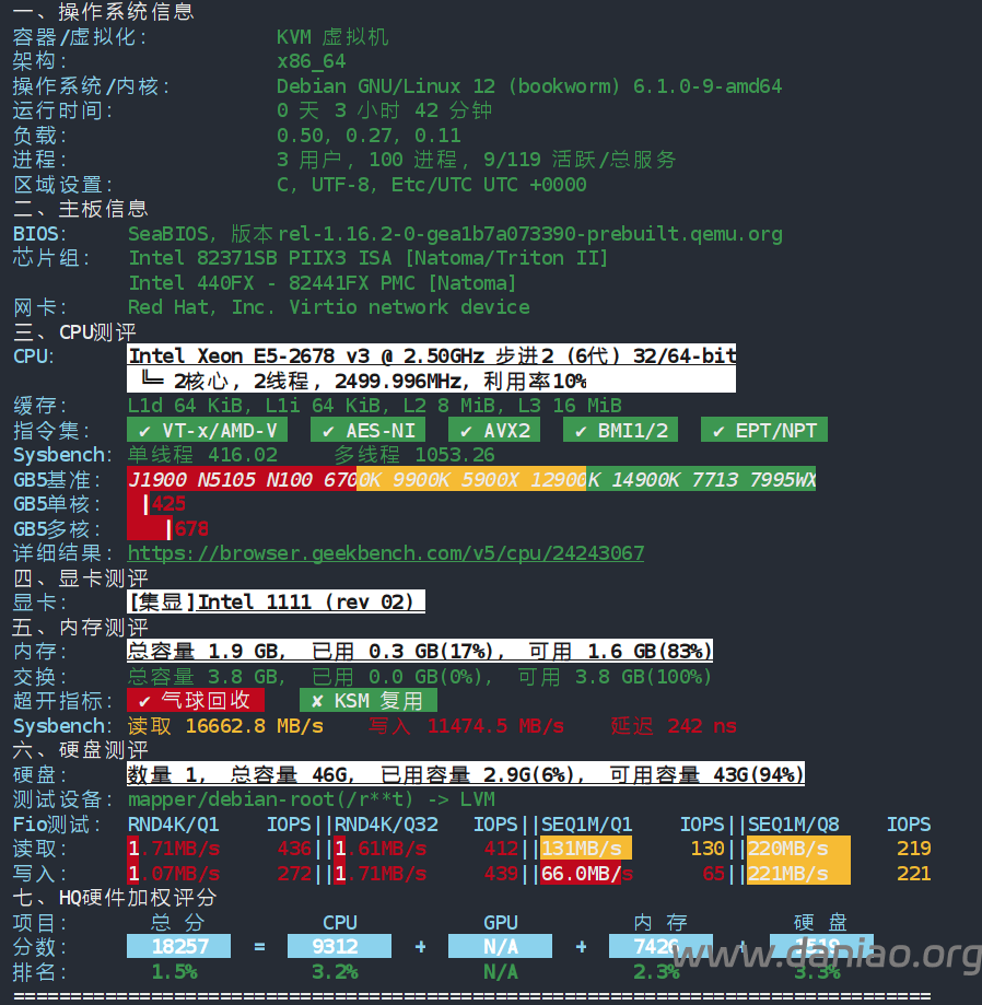 CPU Model : Intel(R) Xeon(R) CPU E5-2678 v3 @ 2.50GHz CPU Cores : 2 @ 2499.996 MHz CPU Cache : 16384 KB AES-NI : ✓ Enabled VM-x/AMD-V : ✓ Enabled Total Disk : 49.9 GB (1.7 GB Used) Total RAM : 1.9 GB (210.2 MB Used) Total Swap : 3.8 GB (780.0 KB Used) System Uptime : 0 days, 5 hour 48 min Load Average : 0.01, 0.09, 0.16 OS : Debian GNU/Linux 12 (bookworm) Arch : x86_64 (64 Bit) Kernel : 6.1.0-9-amd64 TCP Congestion Ctrl: bbr Virtualization : KVM IPv4/IPv6 : ✓ Online / ✗ Offline Organization : AS54801 Zillion Network Inc. Location : Singapore / SG Region : Singapore ---------------------------------------------------------------------- I/O Speed(1st run) : 221 MB/s I/O Speed(2nd run) : 217 MB/s I/O Speed(3rd run) : 220 MB/s I/O Speed(average) : 219.3 MB/s