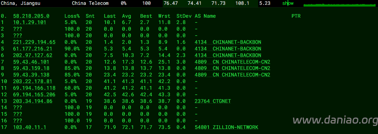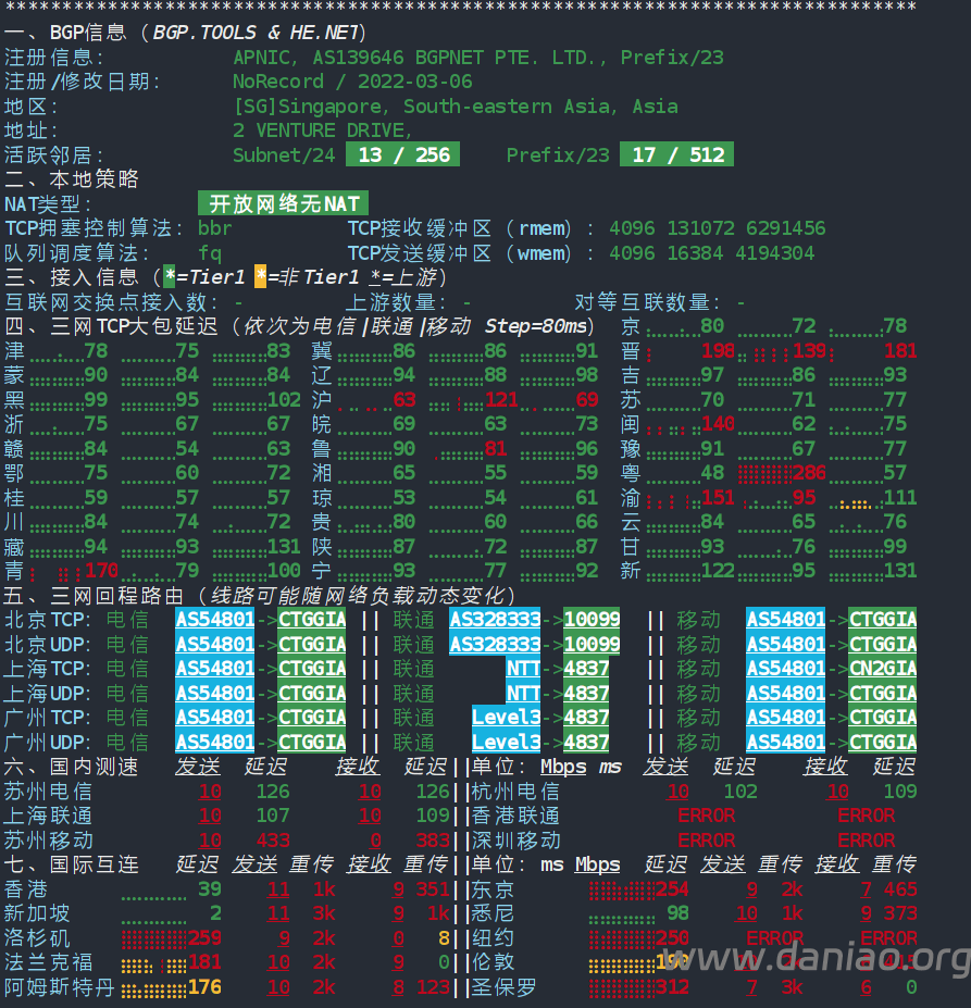 北京 电信 AS54801 -> CTGGIA 地理路径:新加坡 -> 香港 -> 北京 自治系统路径:AS54801 -> AS23764 -> AS4809 -> AS4847 1 6.94ms 109.248.*.* AS54801 新加坡 2 1.45ms 10.148.*.* * RFC1918 7 36.95ms 203.144.*.* * 新加坡 电信 8 36.93ms 69.194.*.* * 新加坡 香港 电信 10 37.09ms 69.194.*.* * 中国 香港 11 70.00ms 203.22.*.* AS23764 [CTG-CN] * 中国 北京 CN2-CTG CTGNet 12-13 73.06ms 59.43.*.* AS4809 [CN2-BackBone] * 中国 北京 chinatelecom.cn 电信 15 82.61ms 106.120.*.* AS4847 [CHINANET-GD] 中国 北京市 bj.189.cn 电信 16-17 83.85ms 36.112.*.* AS4847 中国 北京 bj.189.cn 18 81.66ms 219.141.*.* AS4847 [CHINATELECOM-BJ] 中国 北京 bj.189.cn 19 83.49ms 106.37.*.* AS4847 [CHINANET-HN] 中国 北京 bj.189.cn 上海 电信 AS54801 -> CTGGIA 地理路径:新加坡 -> 香港 -> 上海 自治系统路径:AS54801 -> AS23764 -> AS4809 -> AS4812 1 1.61ms 109.248.*.* AS54801 新加坡 2 0.62ms 10.148.*.* * RFC1918 7 37.89ms 203.144.*.* * 新加坡 电信 8 36.56ms 69.194.*.* AS23764 * 新加坡 电信/CTGNet 9 48.77ms 203.22.*.* [CTG-CN] * 中国 香港 电信 10 37.98ms 69.194.*.* AS23764 * 中国 香港 电信/CTGNet 12-14 63.64ms 59.43.*.* AS4809 [CN2-BackBone] * 中国 上海 X-I chinatelecom.cn 电信 15 71.74ms 101.95.*.* AS4812 [CHINANET-SH] 中国 上海 chinatelecom.cn 电信 21 65.32ms 101.226.*.* AS4812 [CHINANET-SH] 中国 上海市 chinatelecom.cn 电信 广东 电信 AS54801 -> CTGGIA 地理路径:新加坡 -> 香港 -> 广东 自治系统路径:AS54801 -> AS23764 -> AS4809 -> AS4134 1 4.66ms 109.248.*.* AS54801 新加坡 2 0.70ms 10.148.*.* * RFC1918 7 37.69ms 203.144.*.* * 新加坡 电信 8 37.63ms 69.194.*.* AS23764 * 新加坡 电信/CTGNet 9-10 36.35ms 69.194.*.* AS23764 * 中国 香港 电信/CTGNet 13 43.26ms 59.43.*.* AS4809 [CN2-BackBone] * 中国 广东 广州 chinatelecom.cn 电信 14 45.33ms 202.97.*.* AS4134 [CHINANET-BB] 中国 广东 广州 chinatelecom.com.cn 电信 15 45.20ms 113.96.*.* AS4134 [CHINANET-GD] 中国 广东 广州 chinatelecom.com.cn 电信 21 49.28ms 183.47.*.* AS4134 [APNIC-AP] 中国 广东省 广州市 chinatelecom.com.cn 电信